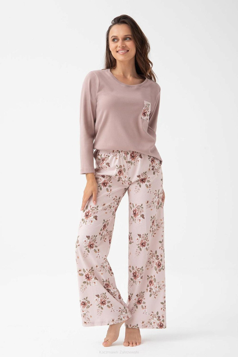 - spodní díl tvoří dlouhé široké kalhoty s výrazným potiskem růžových a mátových květů
