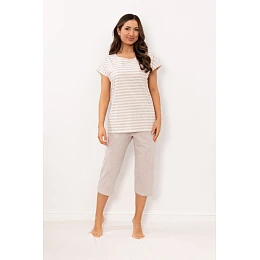 Volné tričko s krátkými rukávy zdobí jemný proužkovaný vzor, který celku dodává lehký a ženský charakter. 3/4 dlouhé kalhoty v jednobarevném provedení soupravu dokonale doplňují a zaručují volnost pohybu a pohodlí při používání. Díky elastickému pasu se pyžamo dokonale přizpůsobí siluetě.