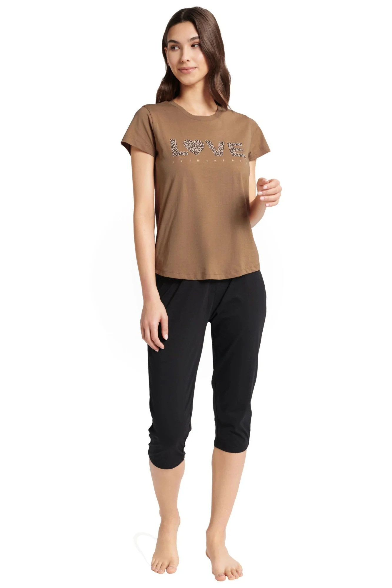 Dámské pyžamo 40615 Boutique Henderson - vyrobené z velmi kvalitní a příjemné bavlny - hnědé tričko s dlouhými rukávy - tričko je ozdobené potiskem - dlouhé jednobarevné kalhoty