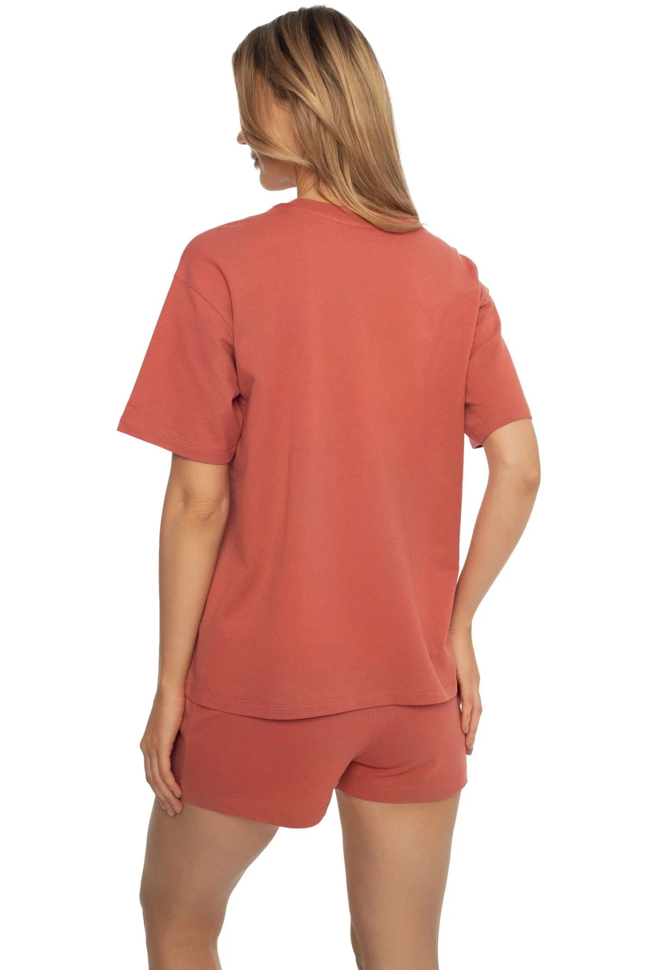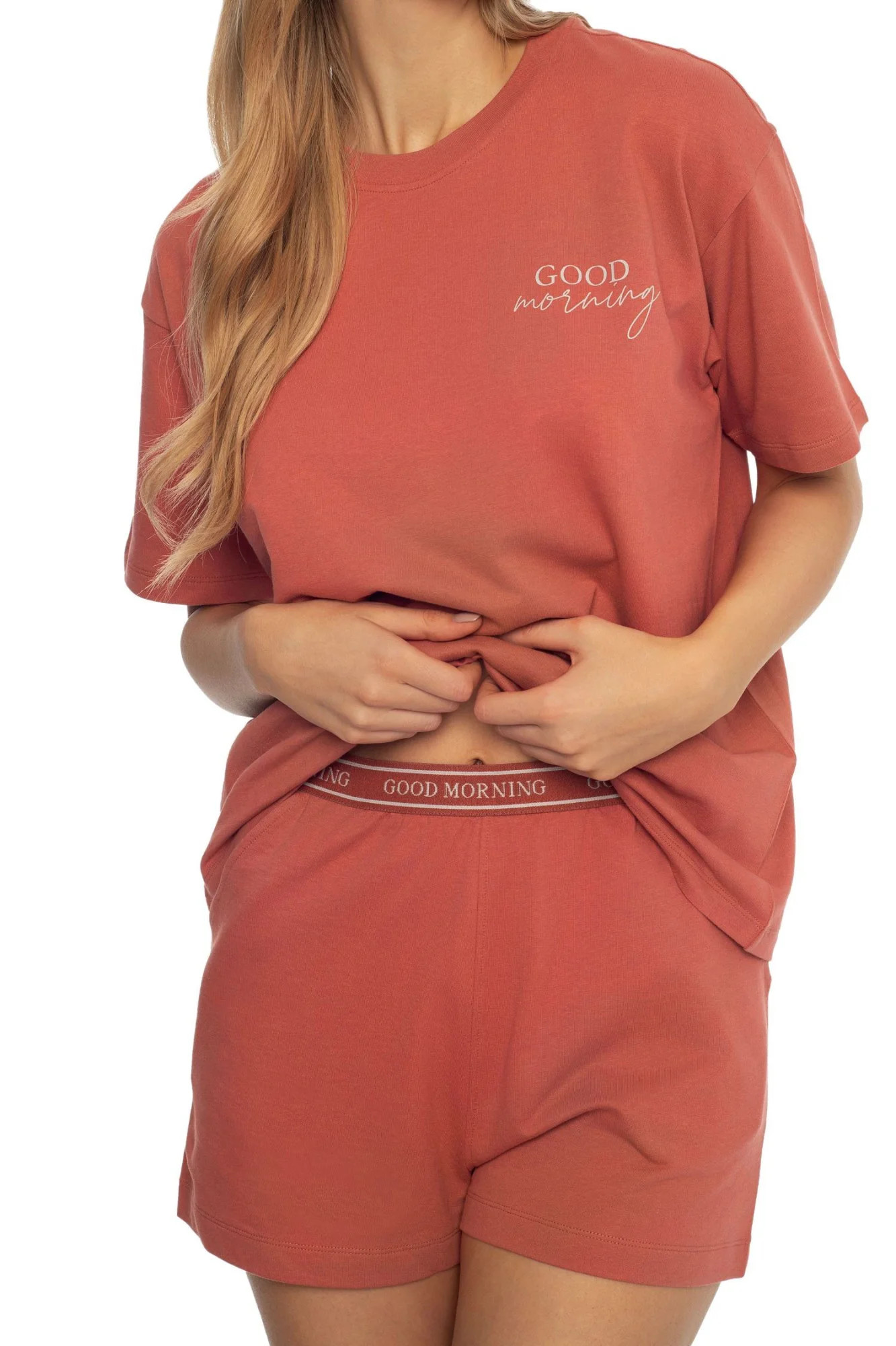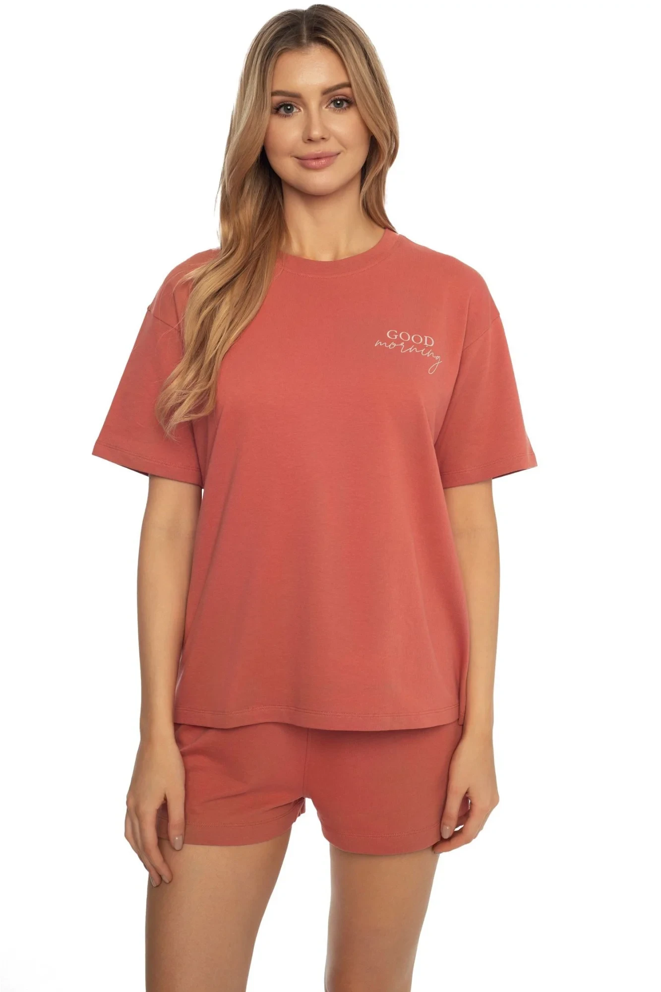 Dámské pyžamo 41314 Abstract pink HENDERSON - vyrobené z vysoce jakostní a příjemné bavlny - růžové tričko s krátkými rukávy - na přední straně je ozdobené potiskem - jednobarevné kraťasy - plochá guma s nápisem v pase