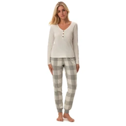 Dámské pyžamo 41895 Farris HENDERSON - z vysoce jakostní bavlny - béžové tričko s dlouhými rukávy - výstřih se zapínáním na knoflíky - dlouhé kárované kalhoty zakončené manžetami - široký elastický pas - materiálové složení trička: 80% bavlna + 20% viskóza