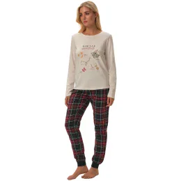 Dámské pyžamo 41902 Florencia HENDERSON - z vysoce jakostní bavlny - halenka béžové barvy s dlouhými rukávy - půlkulatý výstřih - na přední straně zdobená potiskem - dlouhé kárované kalhoty - široký elastický pas - lemy nohavic a rukávů s žebrovaním