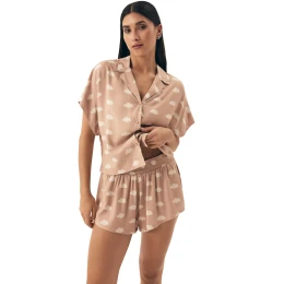 Dámské pyžamo 42645 Nubes HENDERSON - z vysoce jakostní bavlny - béžová košile s krátkými rukávy - zapínání na knoflíky - jednobarevné kraťasy - zdobené potiskem bílých mráčků - široký elastický pás