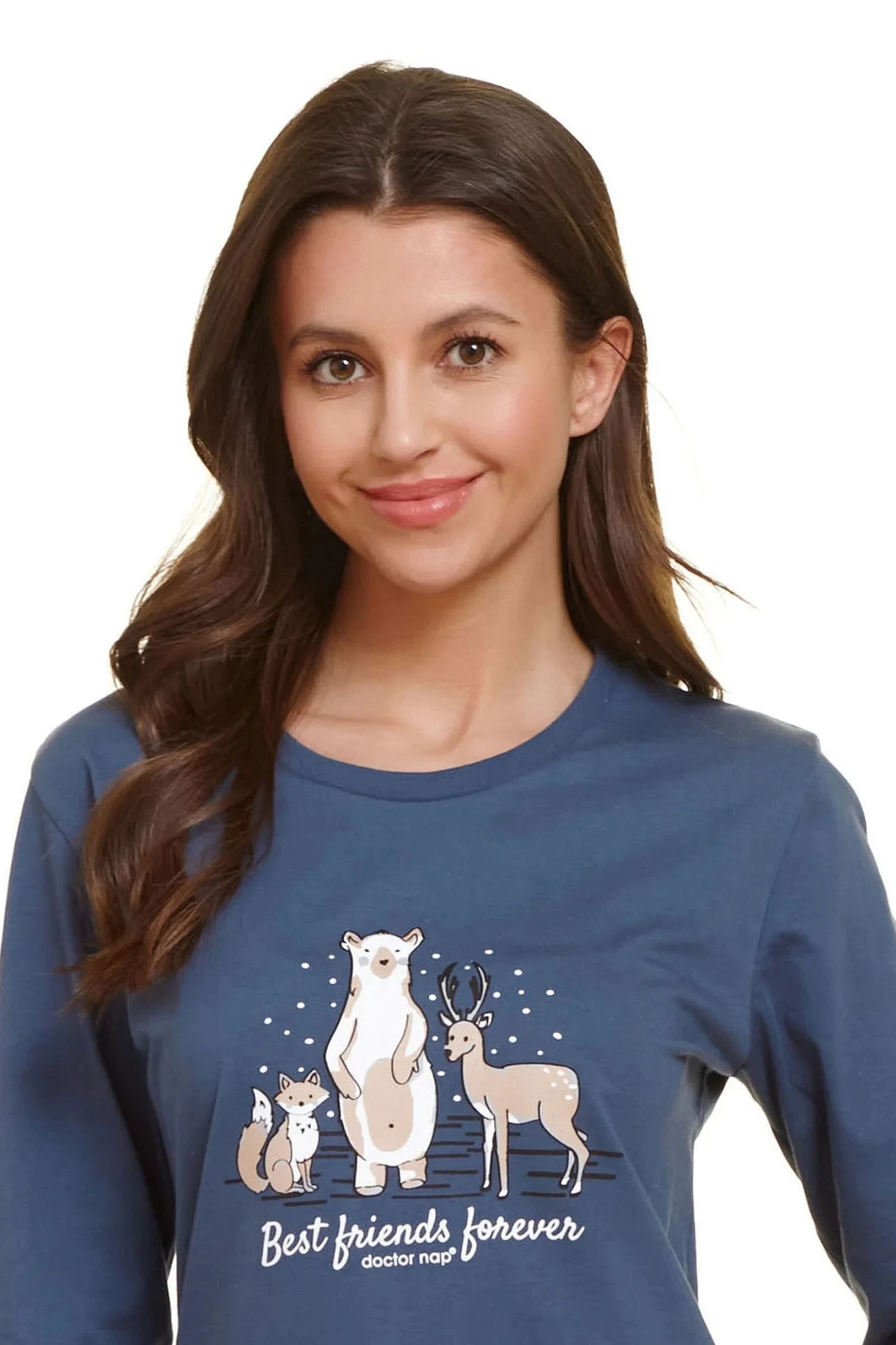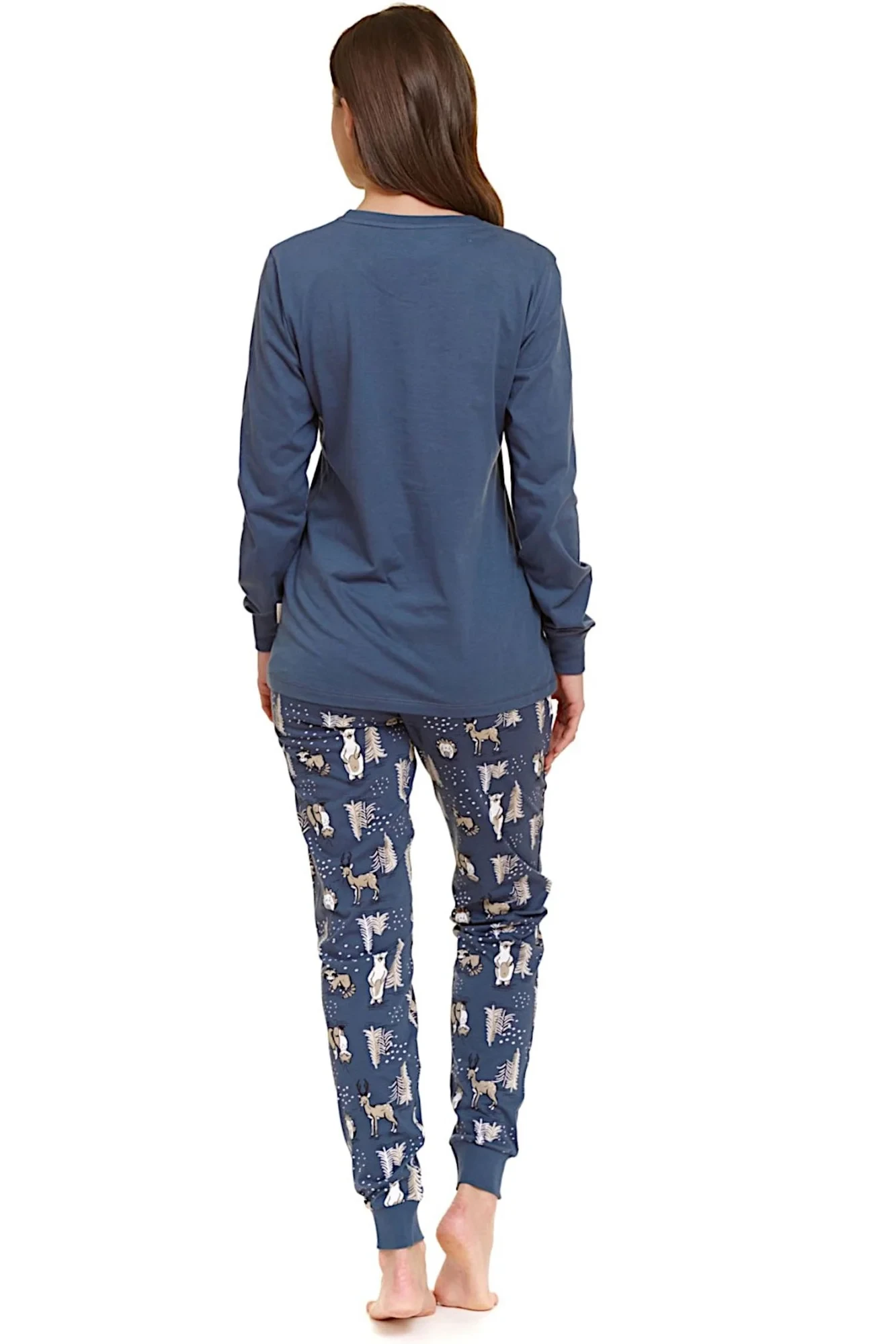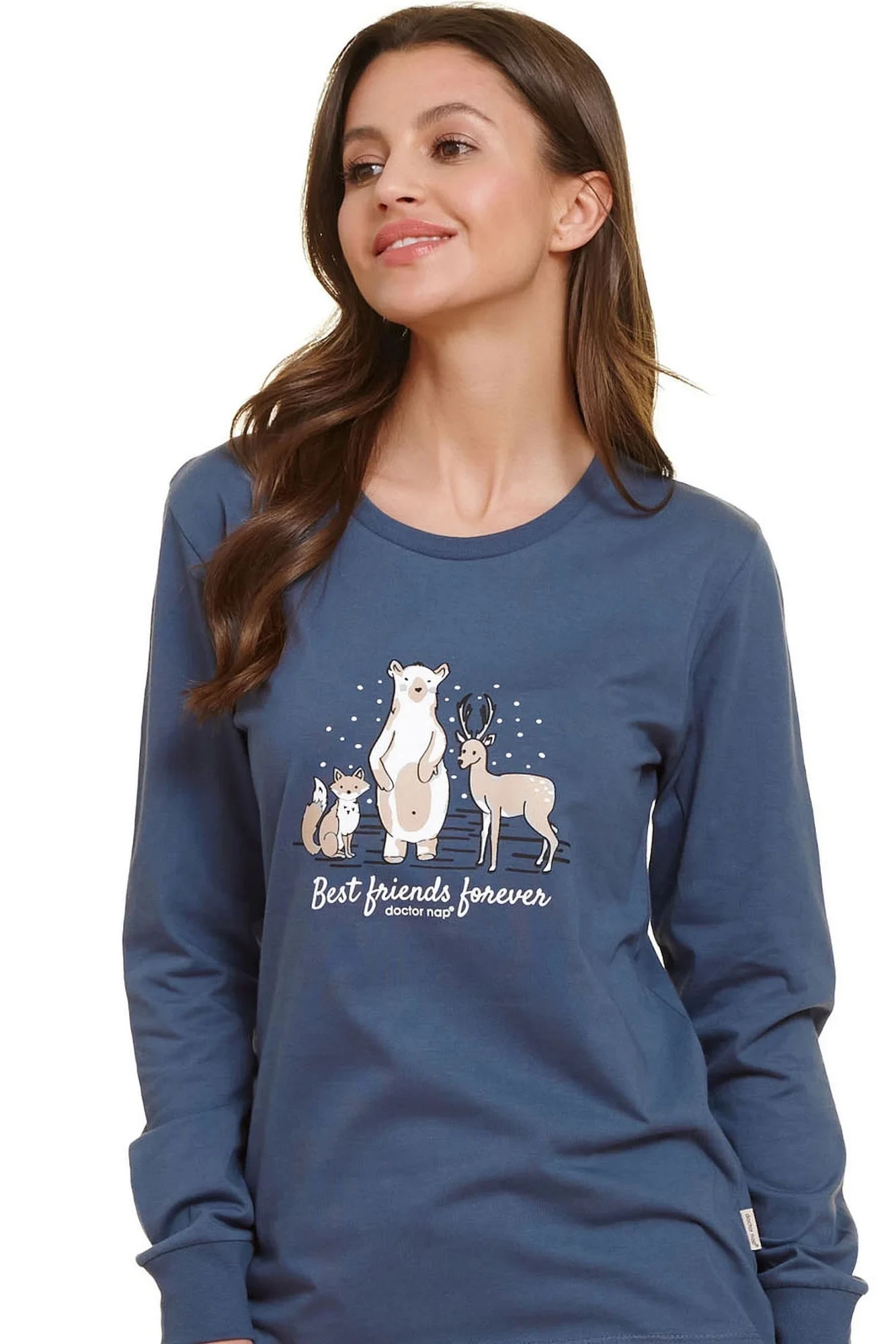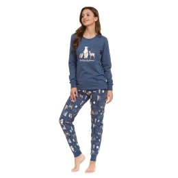Dámské pyžamo 4340 Doctor Nap - vyrobené z velmi kvalitní a příjemné bavlny - modré tričko s dlouhými rukávy - na přední straně ozdobené potiskem - kontrastní lemování manžet a výstřihu - dlouhé vzorované kalhoty s kapsami - certifikát OEKO-TEX Standard 100