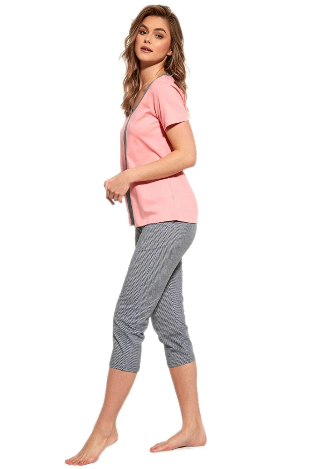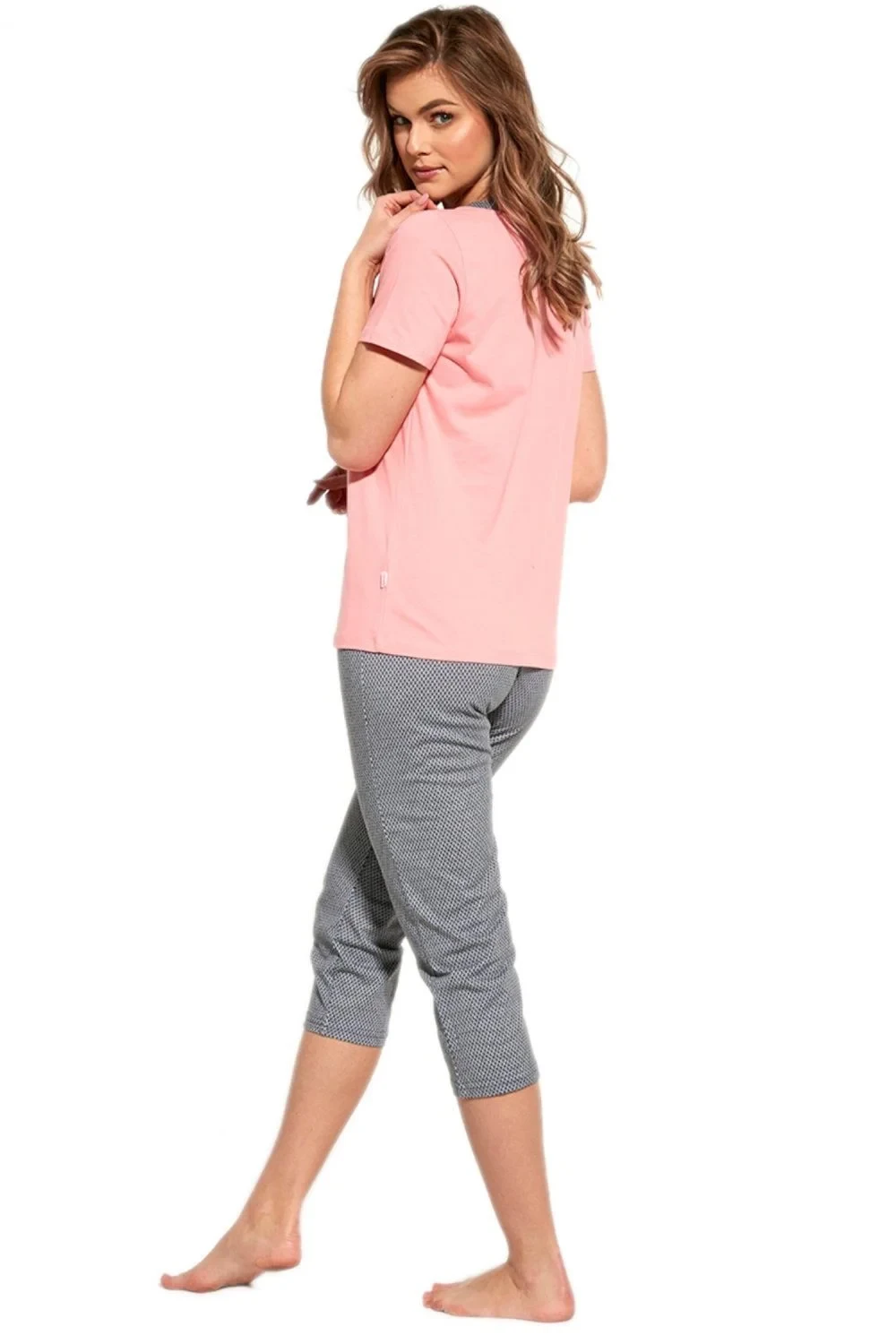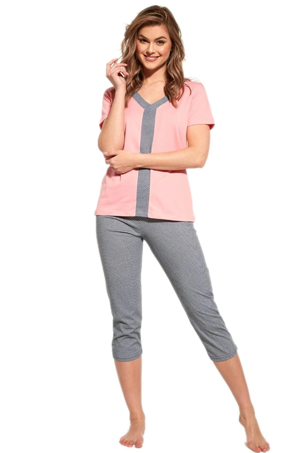 Dámské pyžamo 445/227 plus Cornette - bavlněný materiál je poddajný a jemný na dotek - růžové tričko s krátkými rukávy - pohodlné tříčtvrteční kalhoty - pyžamo je vhodné i na denní nošení