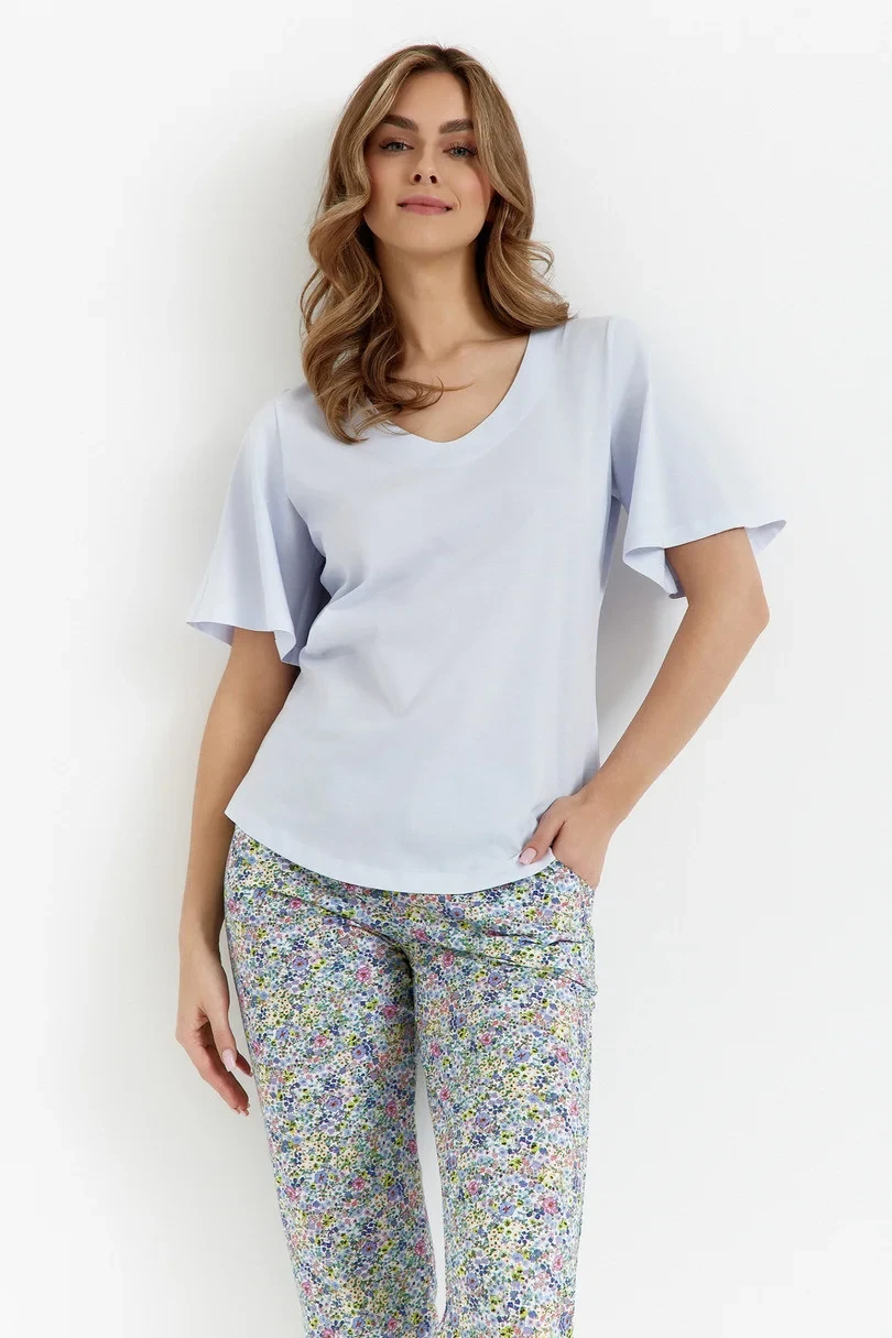 Model wyróżnia się krótkim rękawem oraz spodniami o długości 7/8, co czyni go doskonałym wyborem zarówno na cieplejsze noce, jak i jako wygodny strój domowy. Praktyczne kieszenie dodają funkcjonalności, umożliwiając przechowywanie drobnych przedmiotów. Subtelny, kobiecy design sprawia, że piżama wygląda stylowo, a jednocześnie zapewnia maksymalną wygodę.