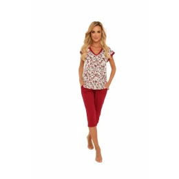 Dámske pyžamo z viskózy, tričko s krátkymi rukávmi a miernym prehybom na prsiach, rukávy lemované kontrastným lamé na nohaviciach, nohavice s 3/4 dĺžkou.