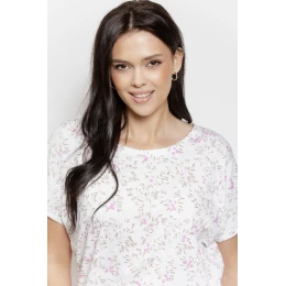 Góra piżamy to bawełniana koszulka z krótkim rękawem i okrągłym dekoltem, ozdobiona subtelnym roślinnym printem, który nadaje całości świeżego i stylowego charakteru. Naturalna bawełna jest miękka, przewiewna i przyjazna dla skóry. Do kompletu dołączone są jednolite spodnie o długości 7/8, wykonane z wysokiej jakości wiskozy z dodatkiem elastanu<EAN čárové kódy zboží jsou: