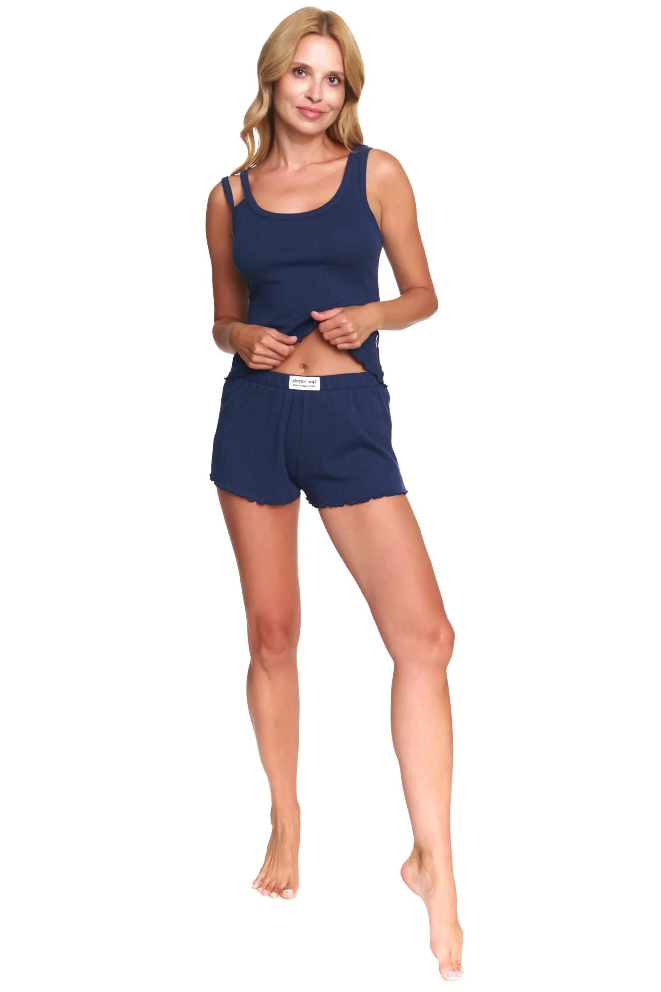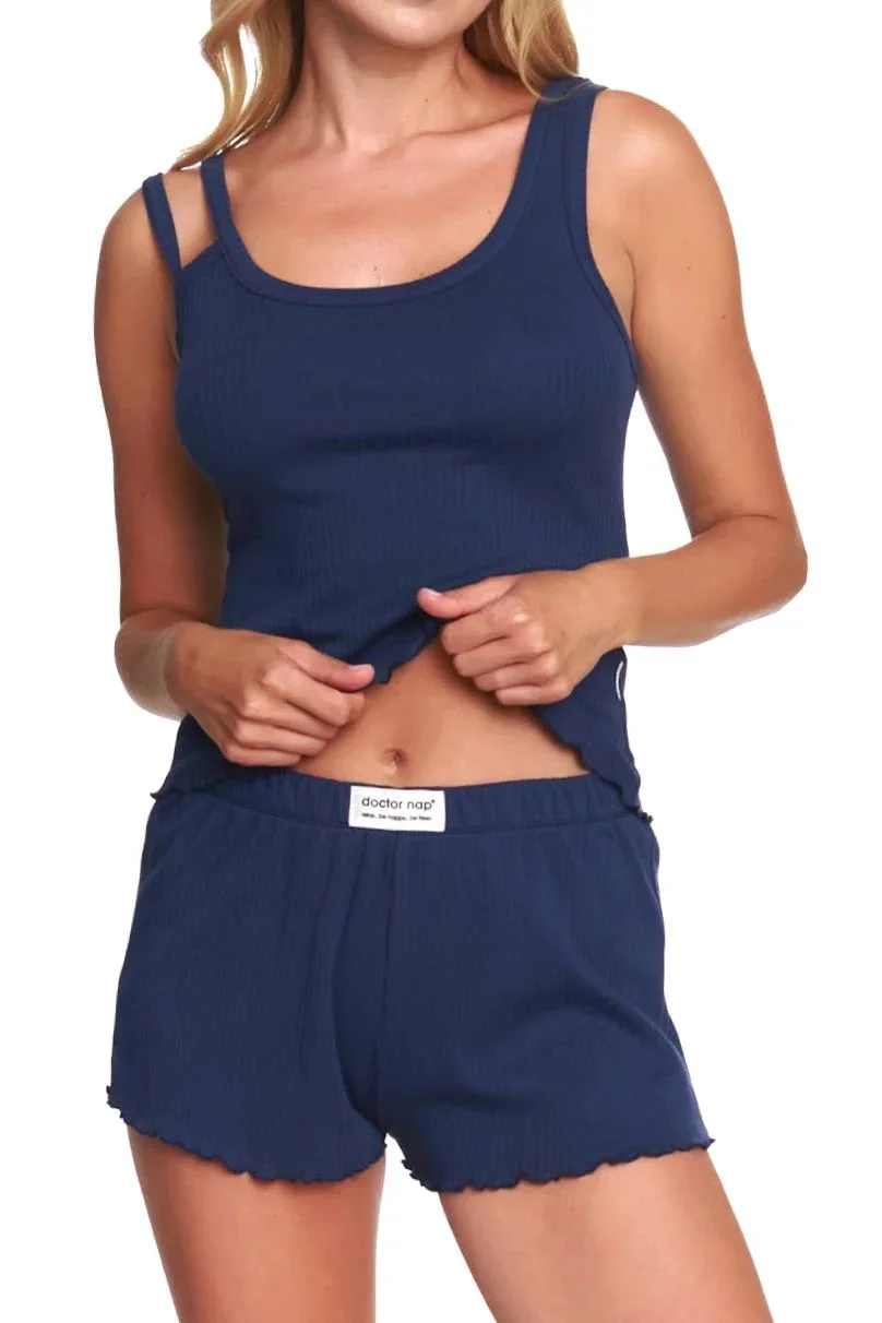 Dámské pyžamo 5138 Doctornap - z vysoce jakostní žebrované bavlny - tmavě modrá košilka s širokými ramínky - kraťasy tmavě modré barvy - zakončené volánky - certifikát OEKO-TEX Standard 100