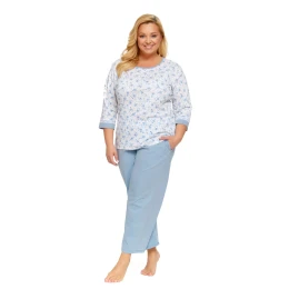 Dámské pyžamo 5278 Doctornap - vyrobené z velmi kvalitní a příjemné bavlny - bílé tričko s tříčtvrtečními rukávy - zdobené modrým potiskem - modré lemování - modré kalhoty s kapsami - certifikát OEKO-TEX Standard 100