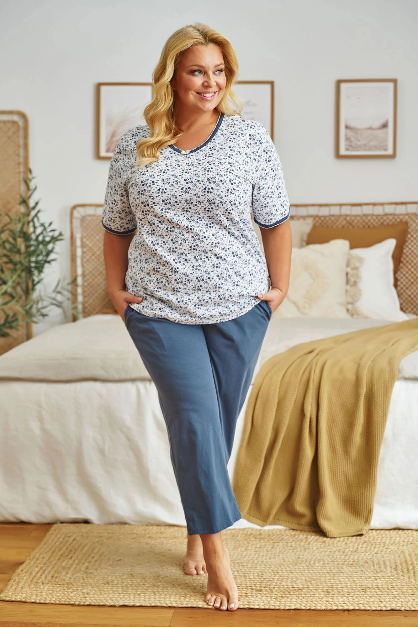 Dámské pyžamo 5290 Doctornap - z vysoce jakostní bavlny - bílé tričko s krátkými rukávy - se vzorem - kalhoty modré barvy s kapsami - výstřih a okraje rukávů zakončené modrým lemováním - certifikát OEKO-TEX Standart 100