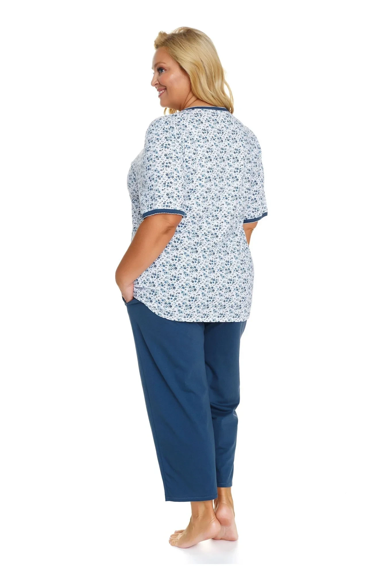 Dámské pyžamo 5290 plus Doctornap - z vysoce jakostní bavlny - bílé tričko s krátkými rukávy - se vzorem - kalhoty modré barvy s kapsami - výstřih a okraje rukávů zakončené modrým lemováním - certifikát OEKO-TEX Standart 100