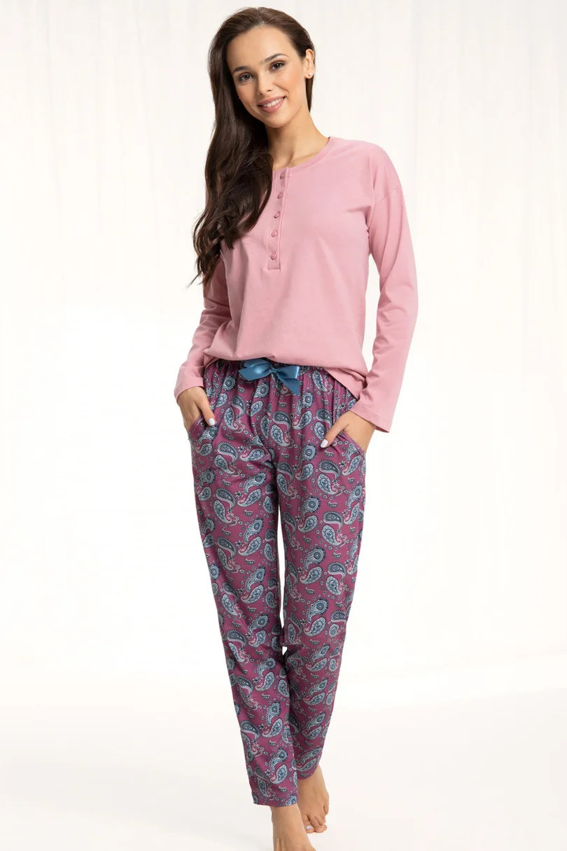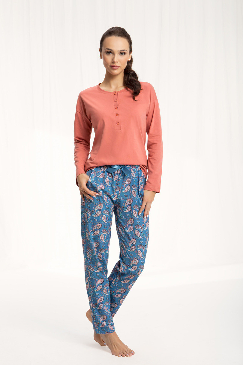 Jednobarevná blůza pyžama má dlouhé rukávy, půlkulatý výstřih a zapínání typu "polo" s pěti knoflíčky. Potištěné dlouhé kalhoty mají praktické kapsy. Potištěné dlouhé kalhoty se vzorem "paisley" mají praktické kapsy a v pase mají mašli.