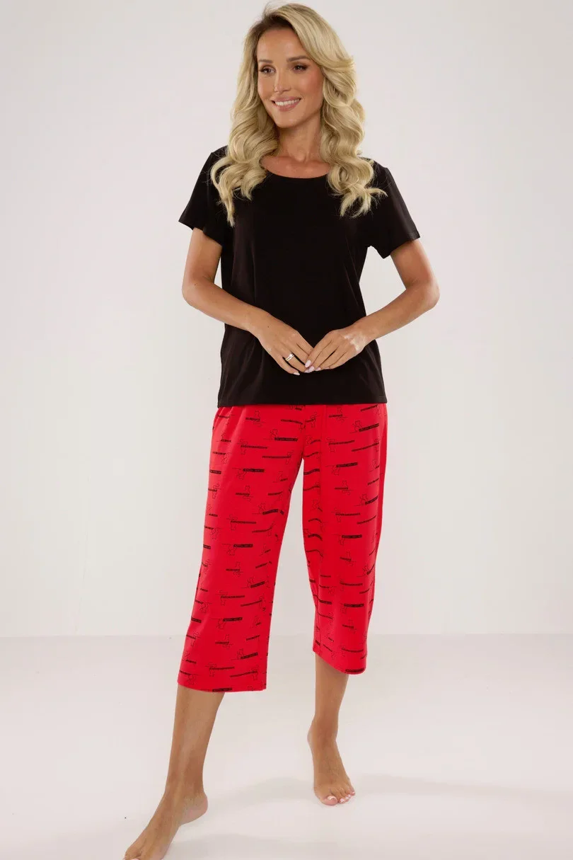 Blůza pyžama má krátké rukávy a kulatý výstřih. Komplet doplňují 3/4 kalhoty.