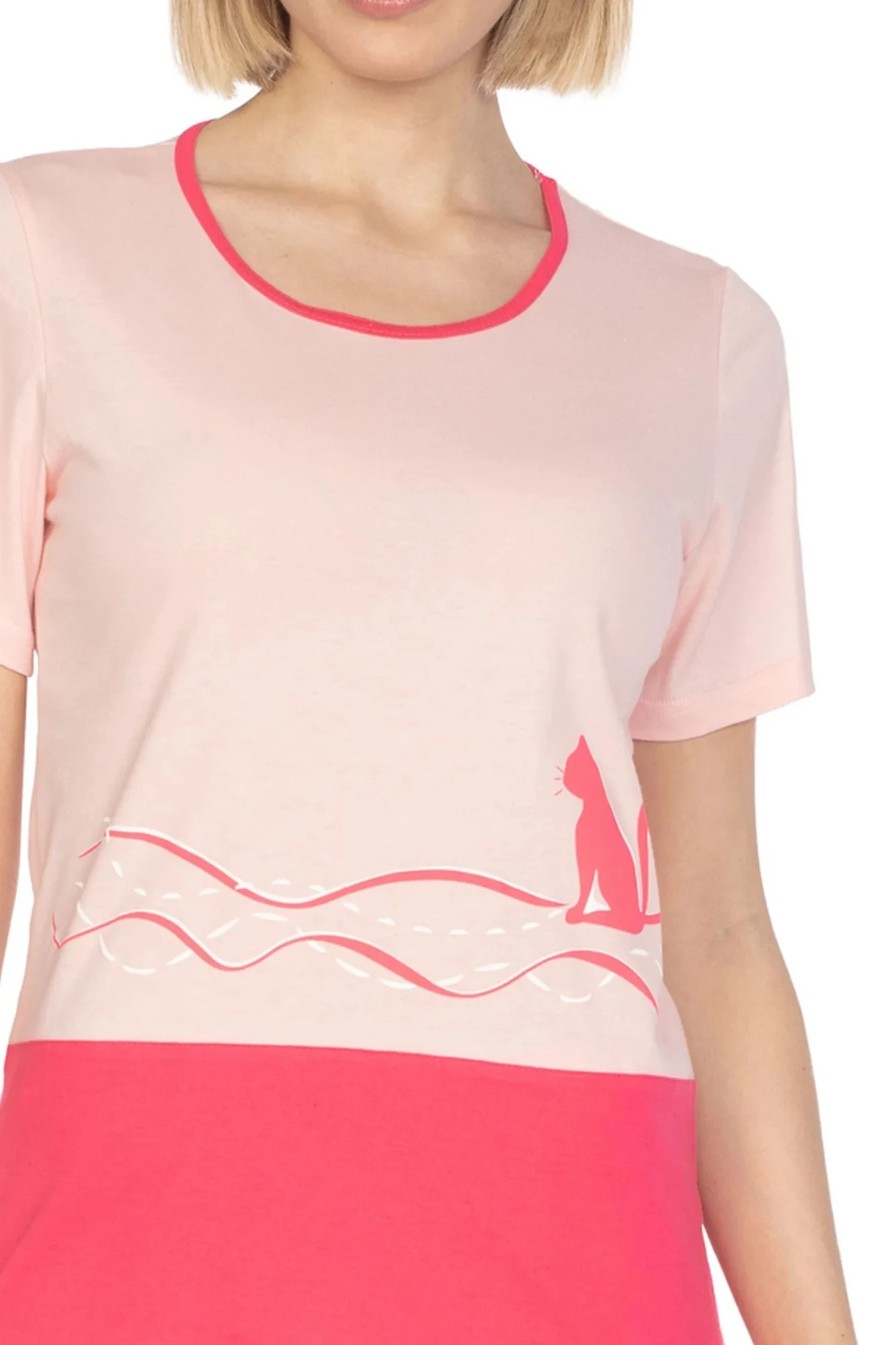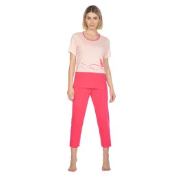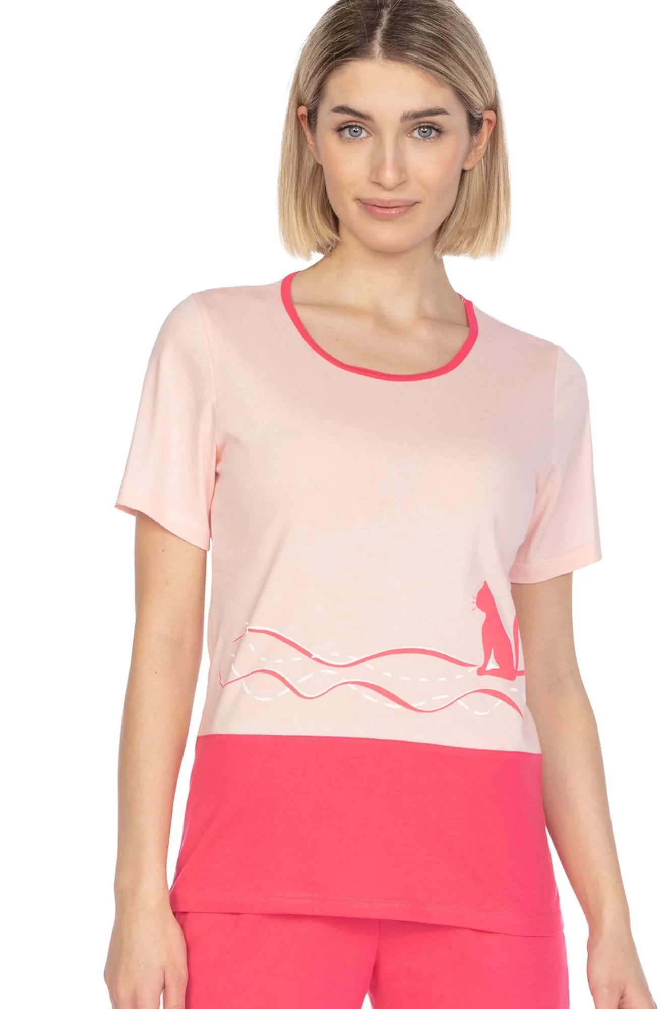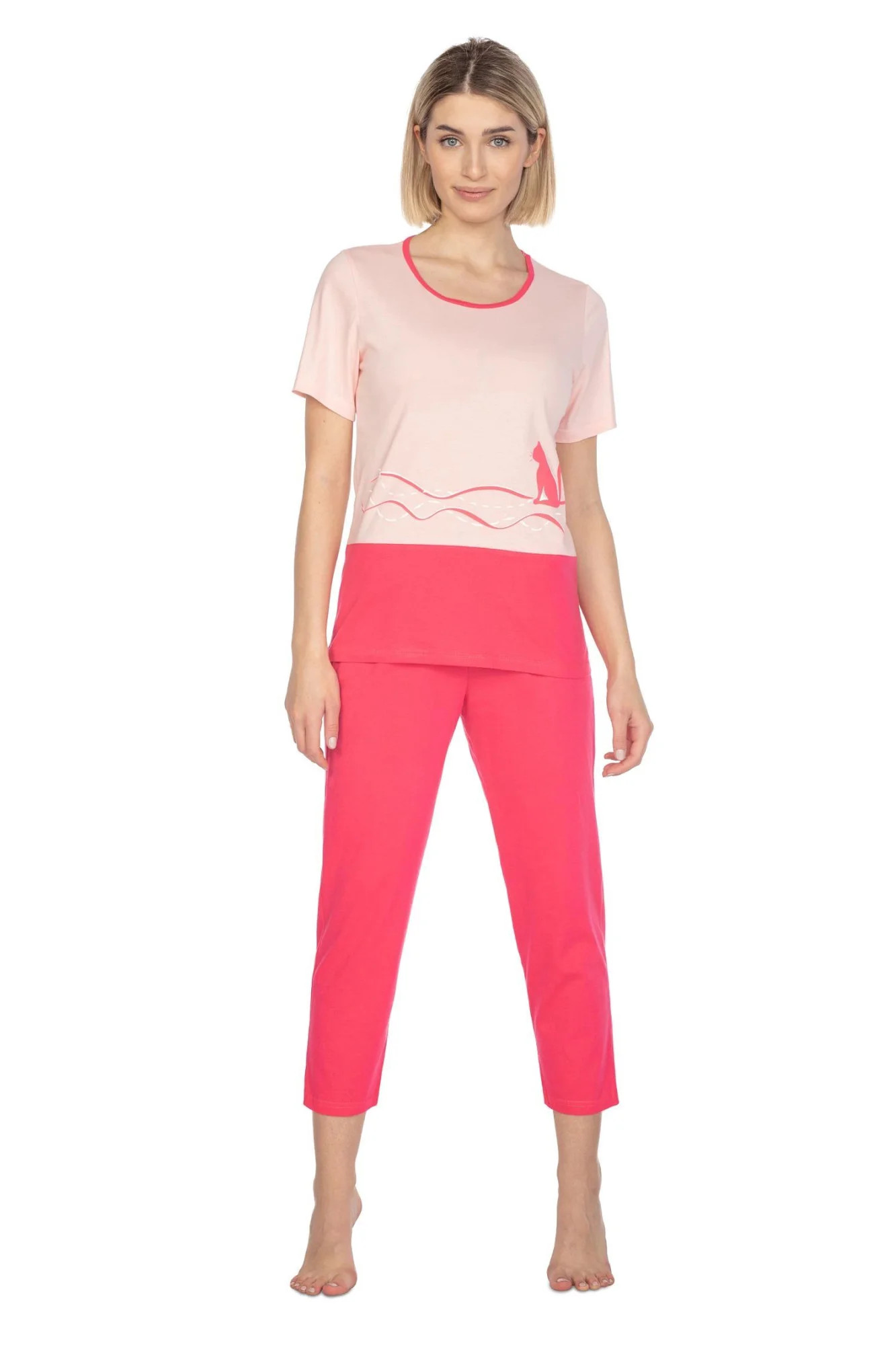 Dámské pyžamo 663 pink REGINA - z vysoce jakostní bavlny - růžové tričko s krátkými rukávy - ozdobené potiskem na přední straně - výstřih, potisk a spodní část trička v barvě kalhot - pohodlné jednobarevné kalhotyMateriálové složení: 100% bavlna