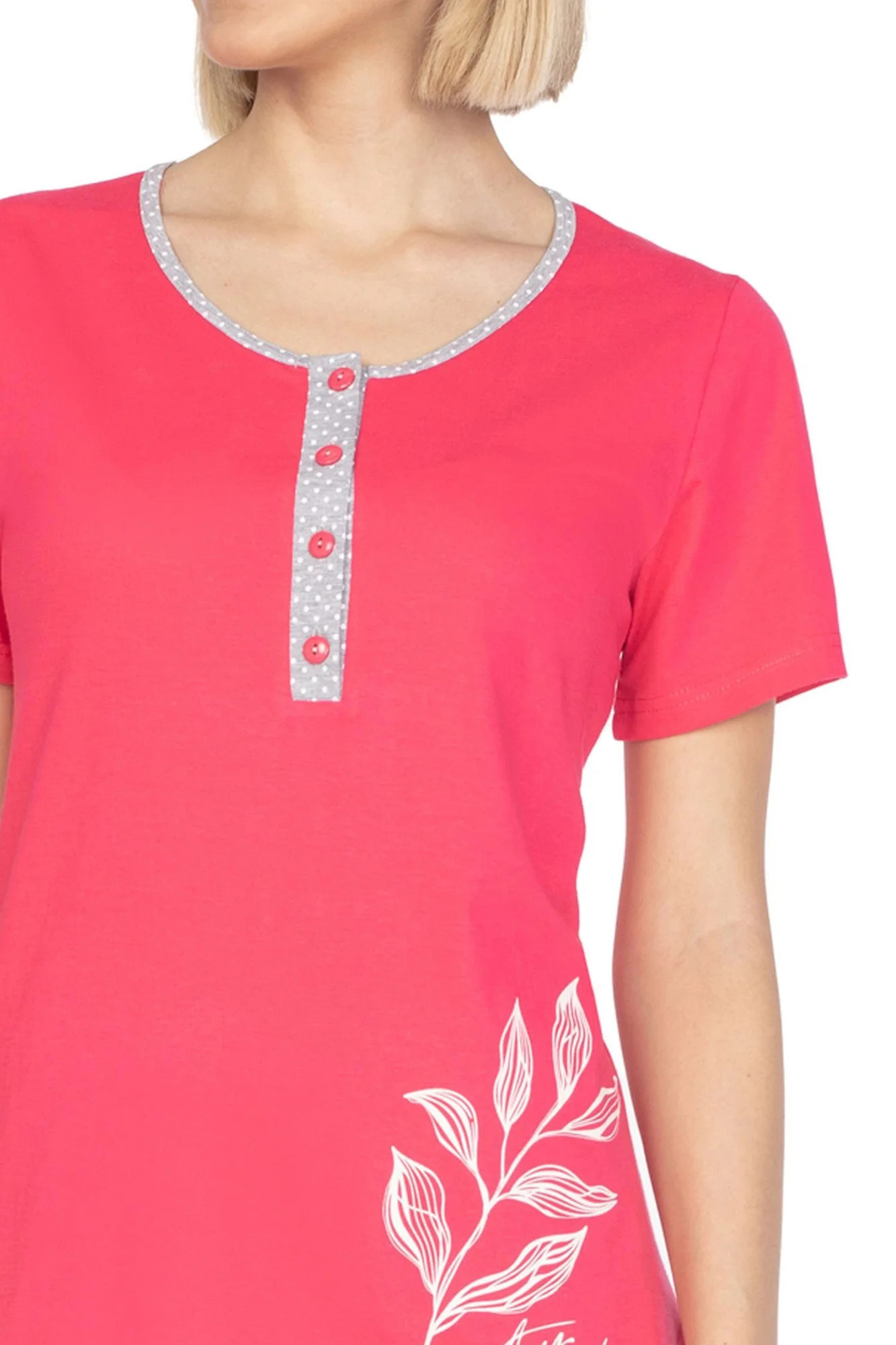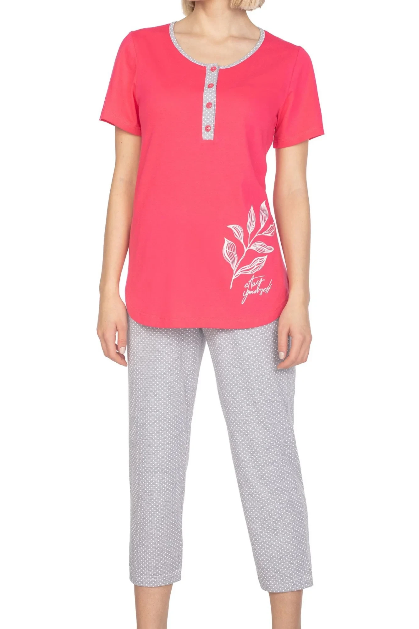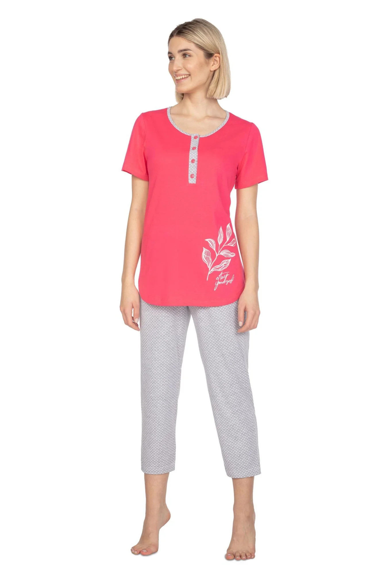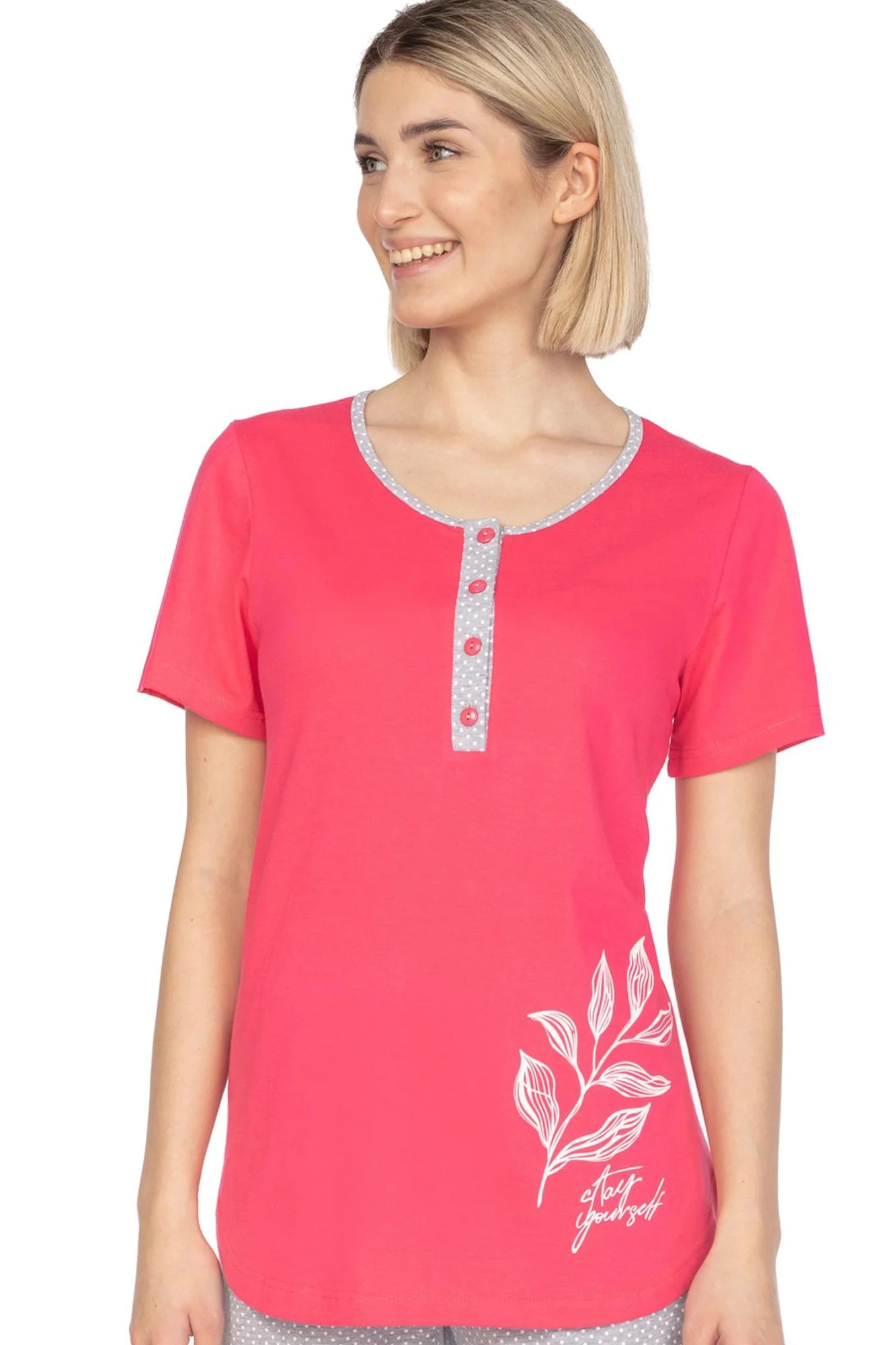 Dámské pyžamo 665 red plus REGINA - z vysoce jakostní bavlny - malinové tričko s krátkými rukávy - zapínání na knoflíky - zdobené potiskem na přední straně - pohodlné vzorované kalhoty