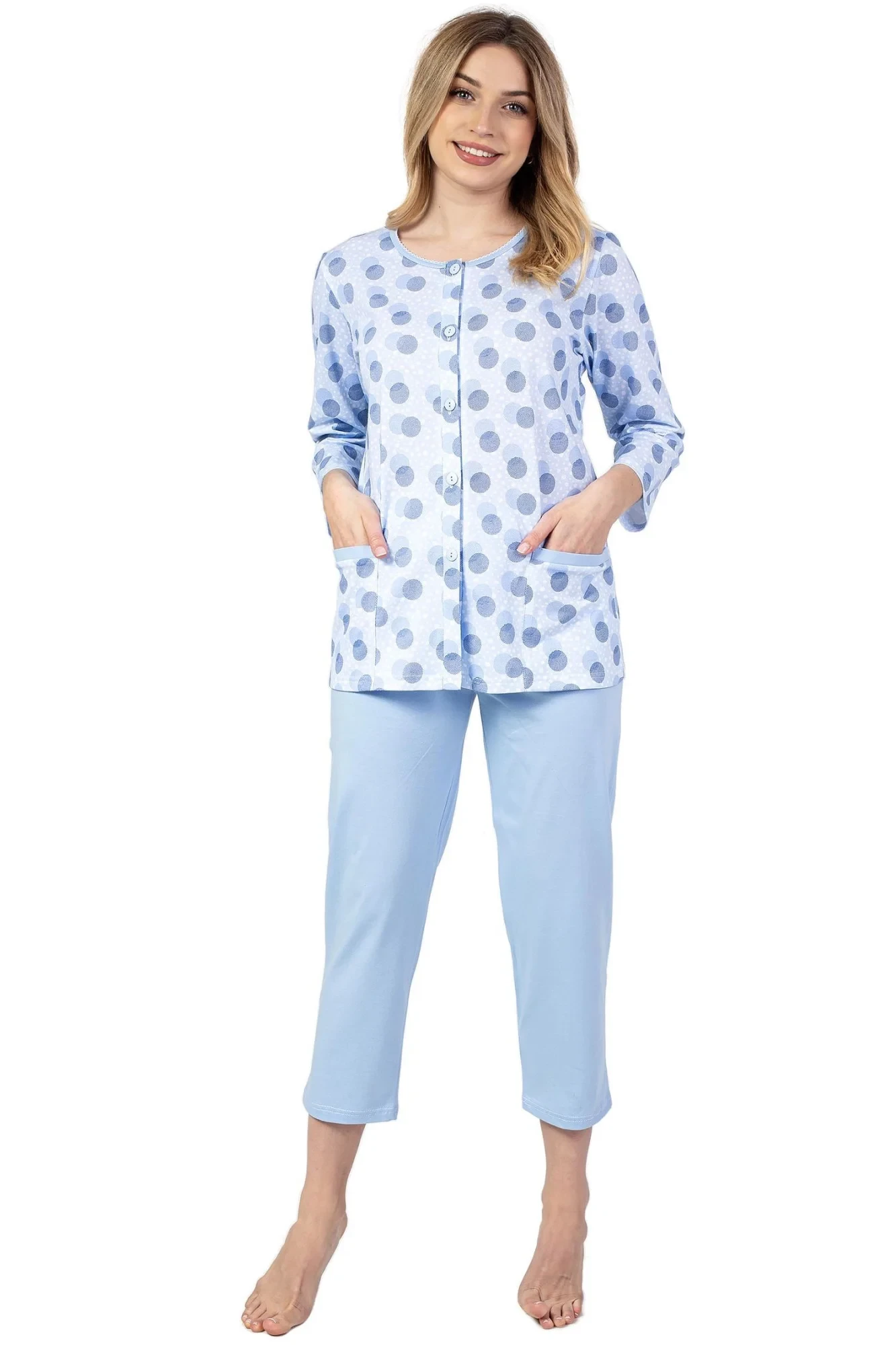 Dámské pyžamo 670 pink REGINA - z vysoce jakostní bavlny - růžová košile s tříčtvrtečními rukávy - se vzorem - zapínání na knoflíky - kapsy na bocích - pohodlné růžové kalhoty