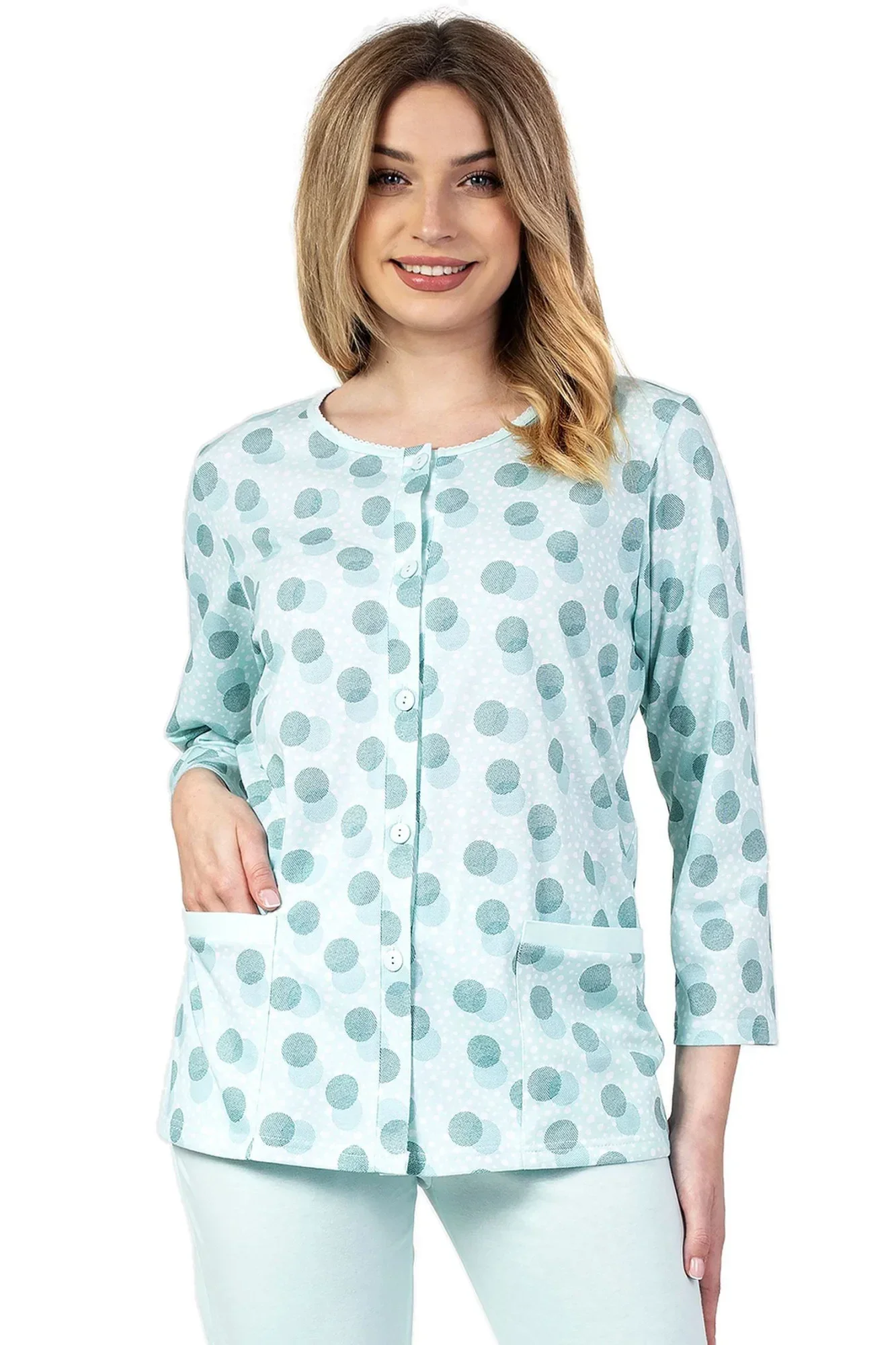 Dámské pyžamo 670 green REGINA - z vysoce jakostní bavlny - zelená košile s tříčtvrtečními rukávy - se vzorem - zapínání na knoflíky - kapsy na bocích - pohodlné zelené kalhotyMateriálové složení: 100% bavlna
