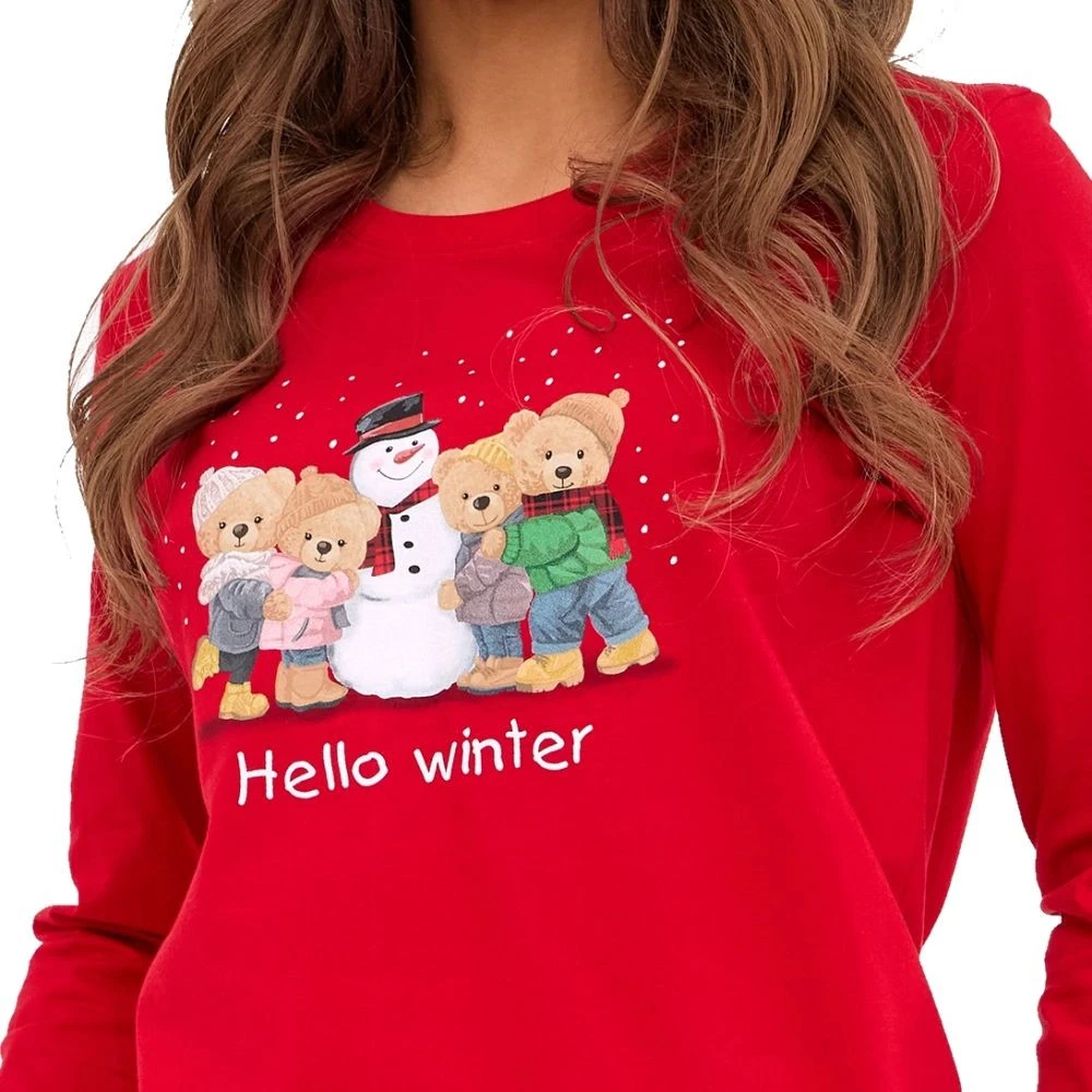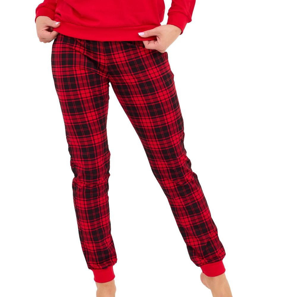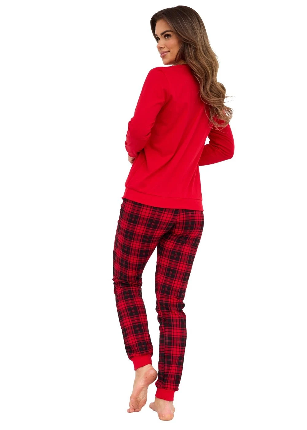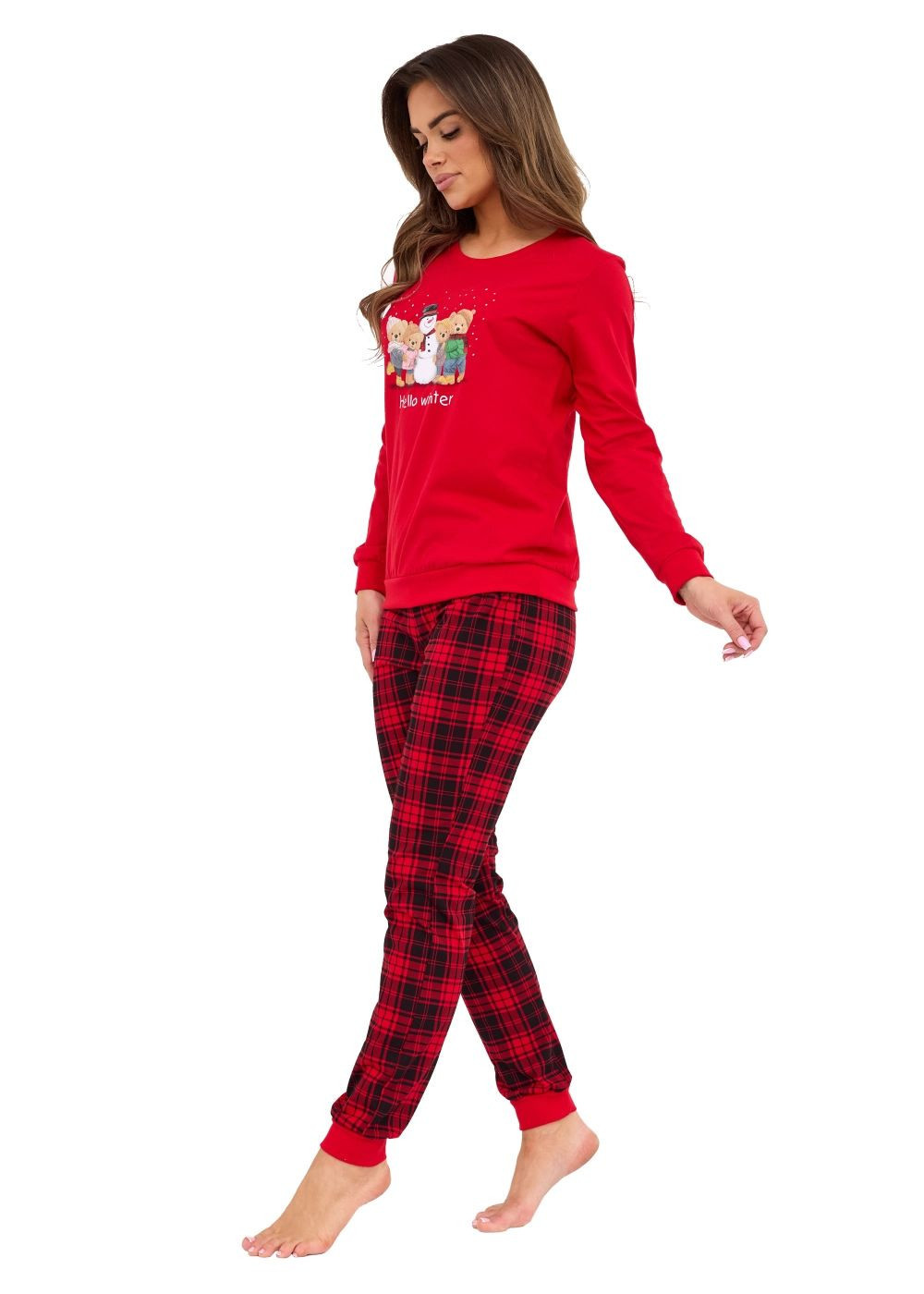 Dámské pyžamo 671/421 Winter CORNETTE - z vysoce jakostní bavlny - červené tričko s dlouhými rukávy - kulatý výstřih - přední strana ozdobená potiskem - dlouhé kárované nohavice zakončené stahovacím lemem