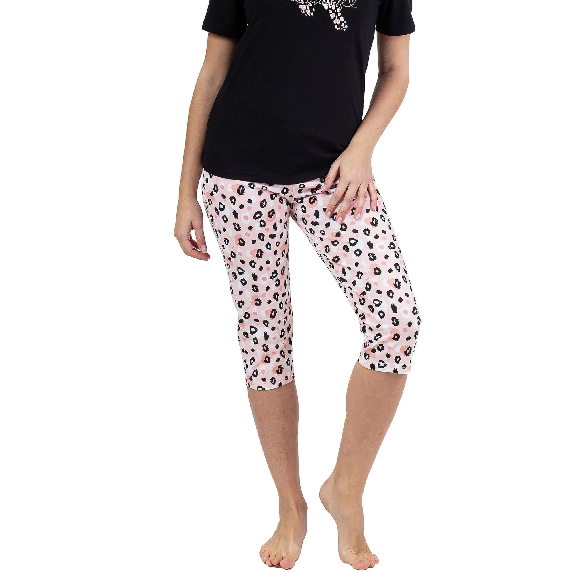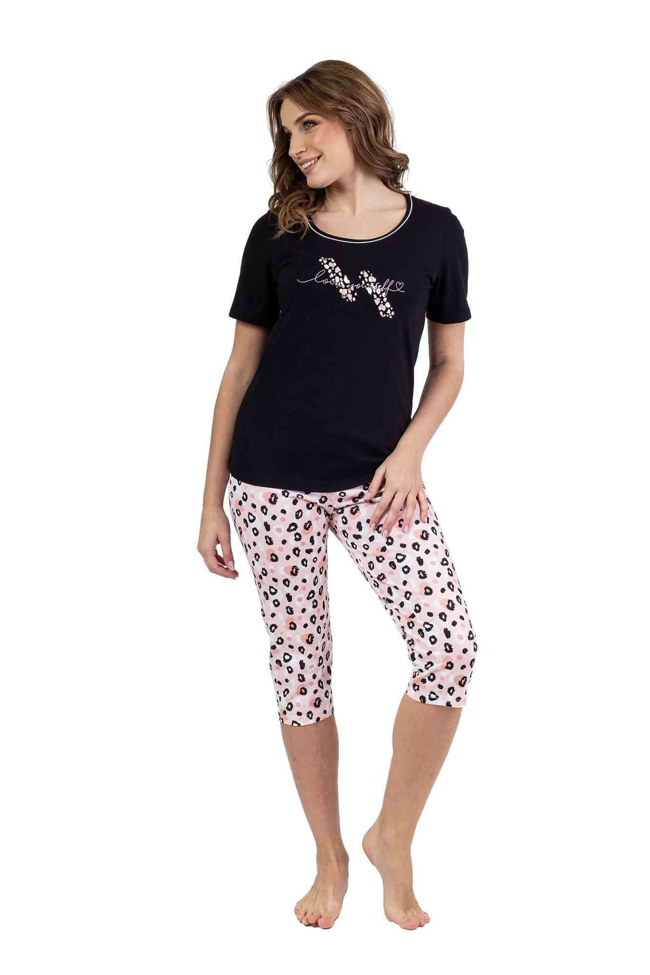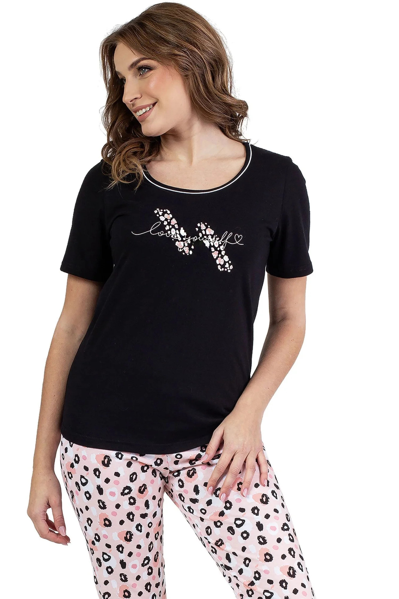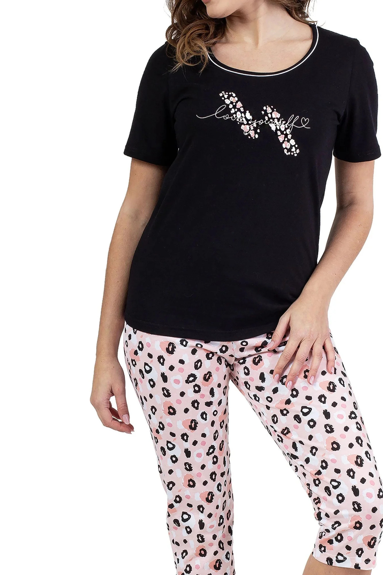 Dámské pyžamo 689 black REGINA - z vysoce jakostní bavlny - černé tričko s krátkými rukávy - zdobené potiskem na přední straně - vzorované capri kalhoty