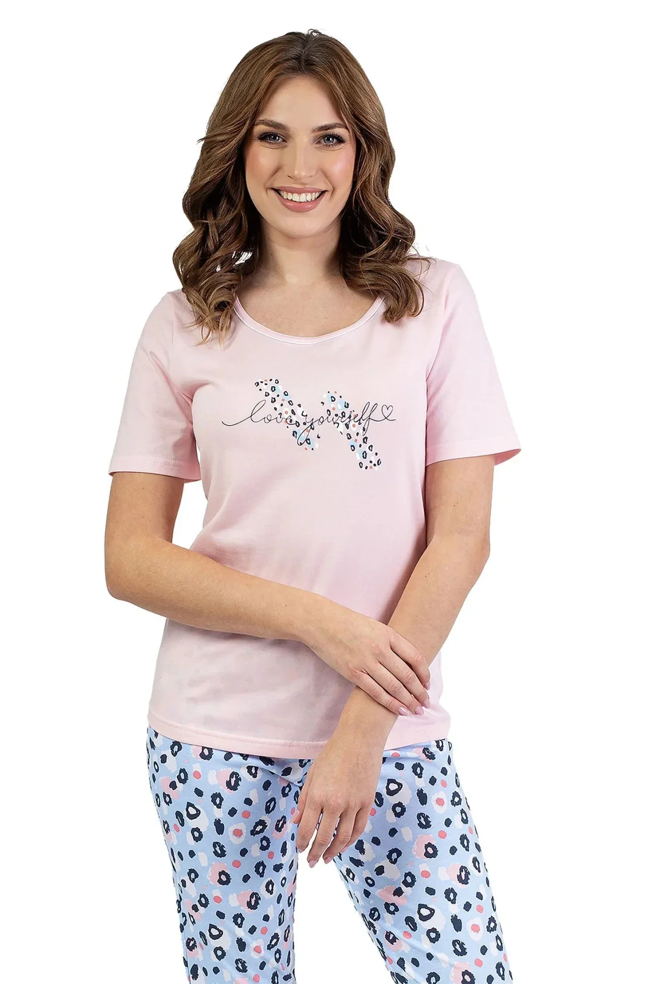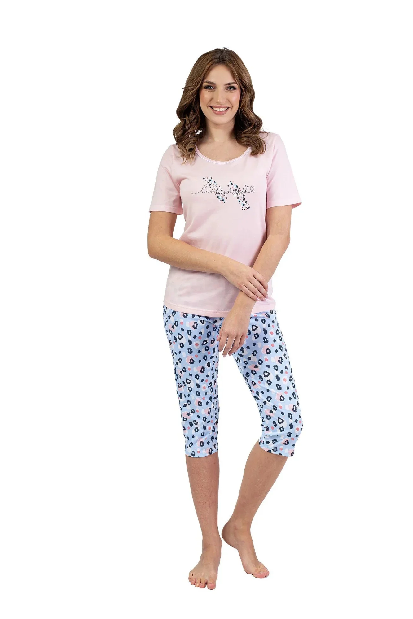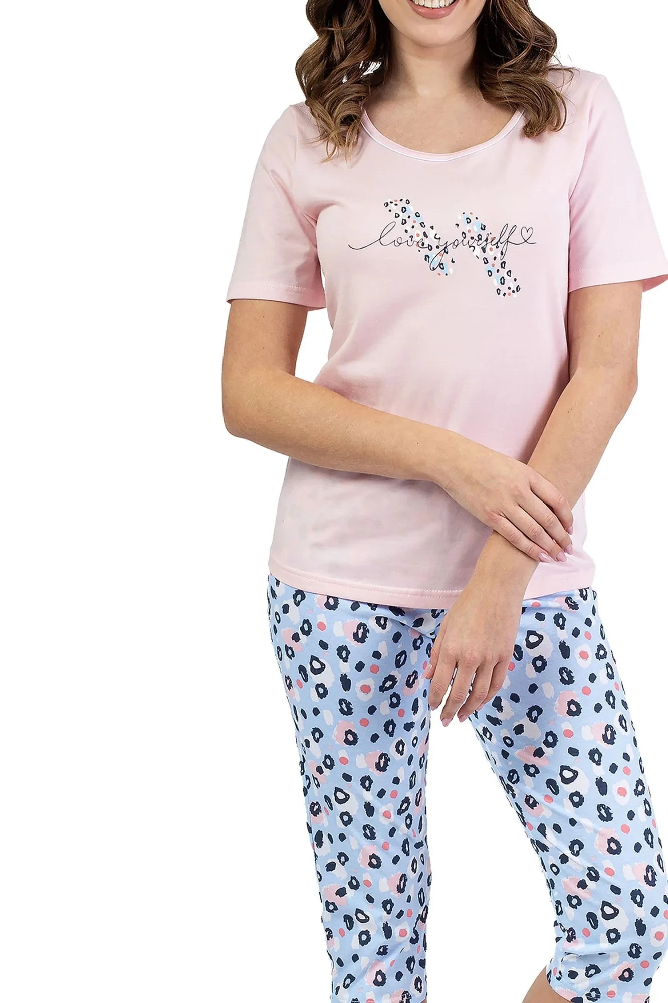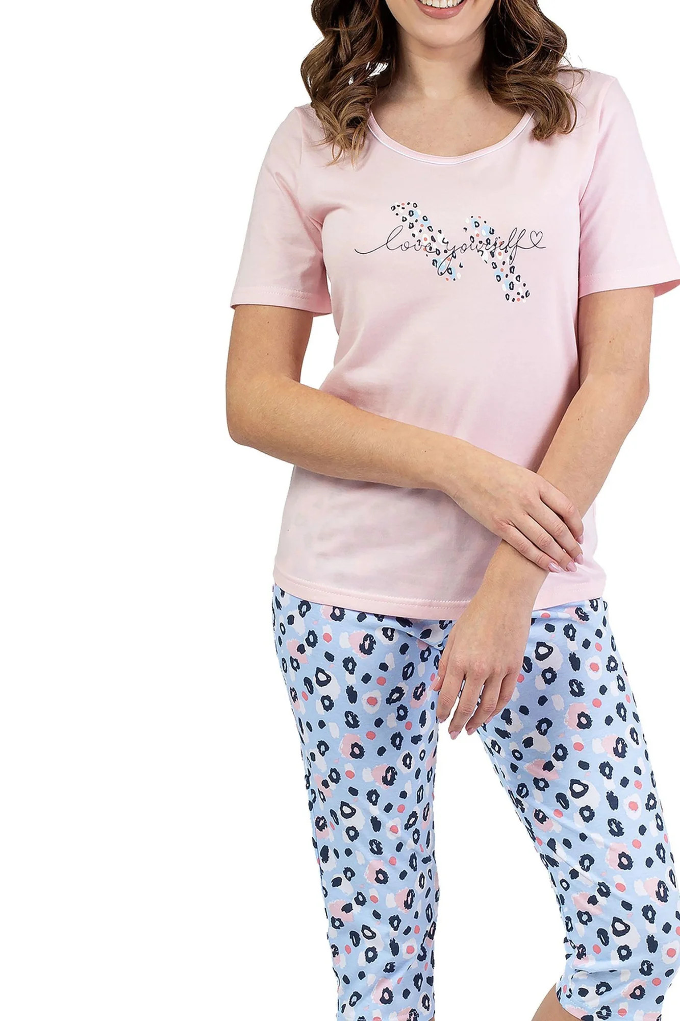 Dámské pyžamo 689 pink REGINA - z vysoce jakostní bavlny - růžové tričko s krátkými rukávy - zdobené potiskem na přední straně - vzorované capri kalhoty