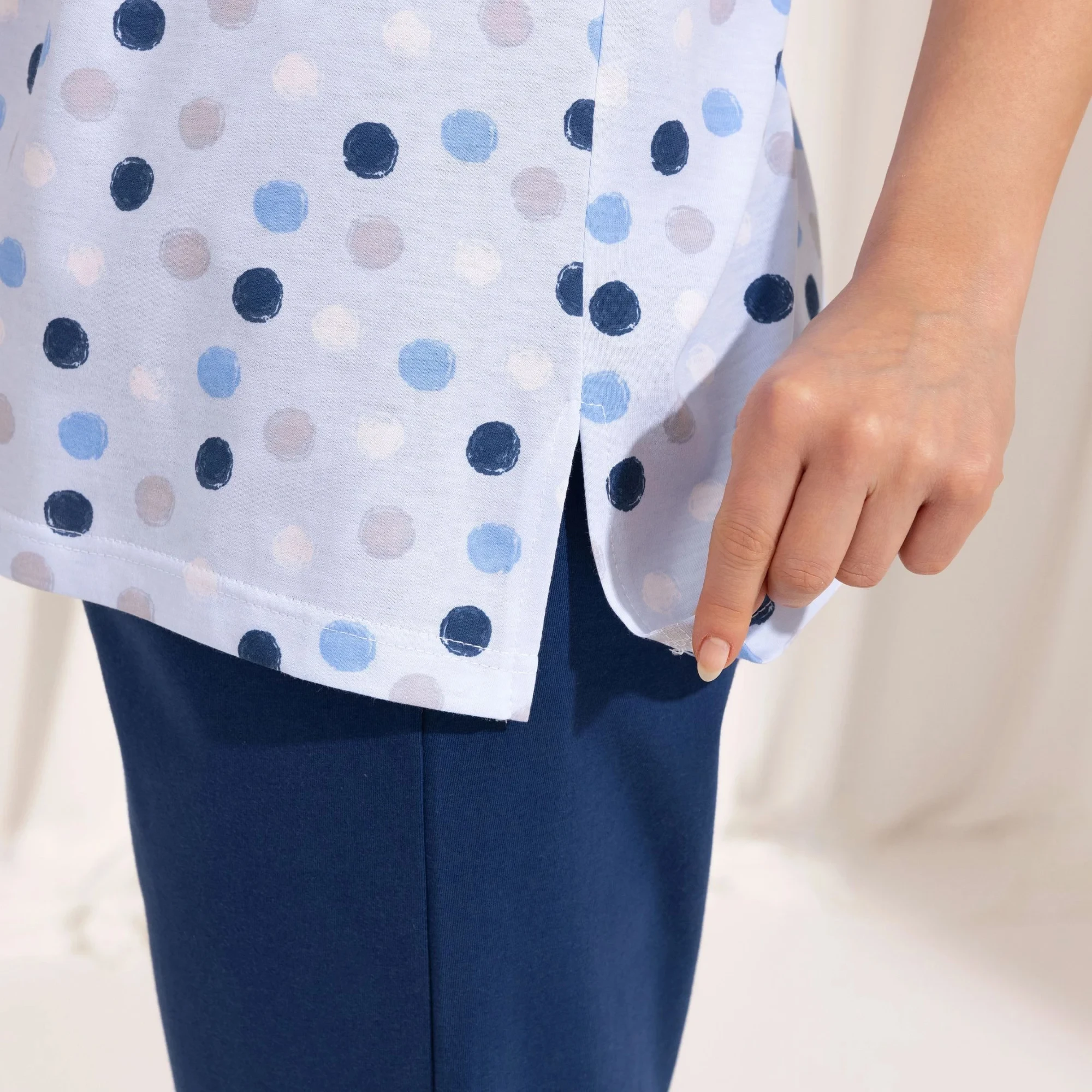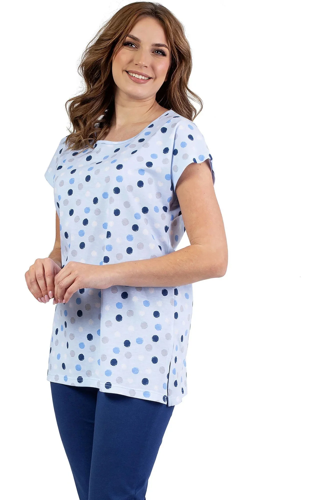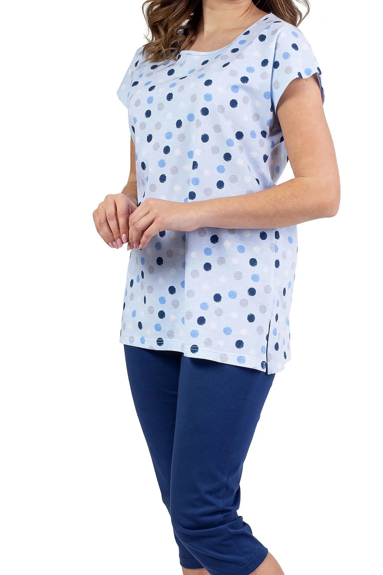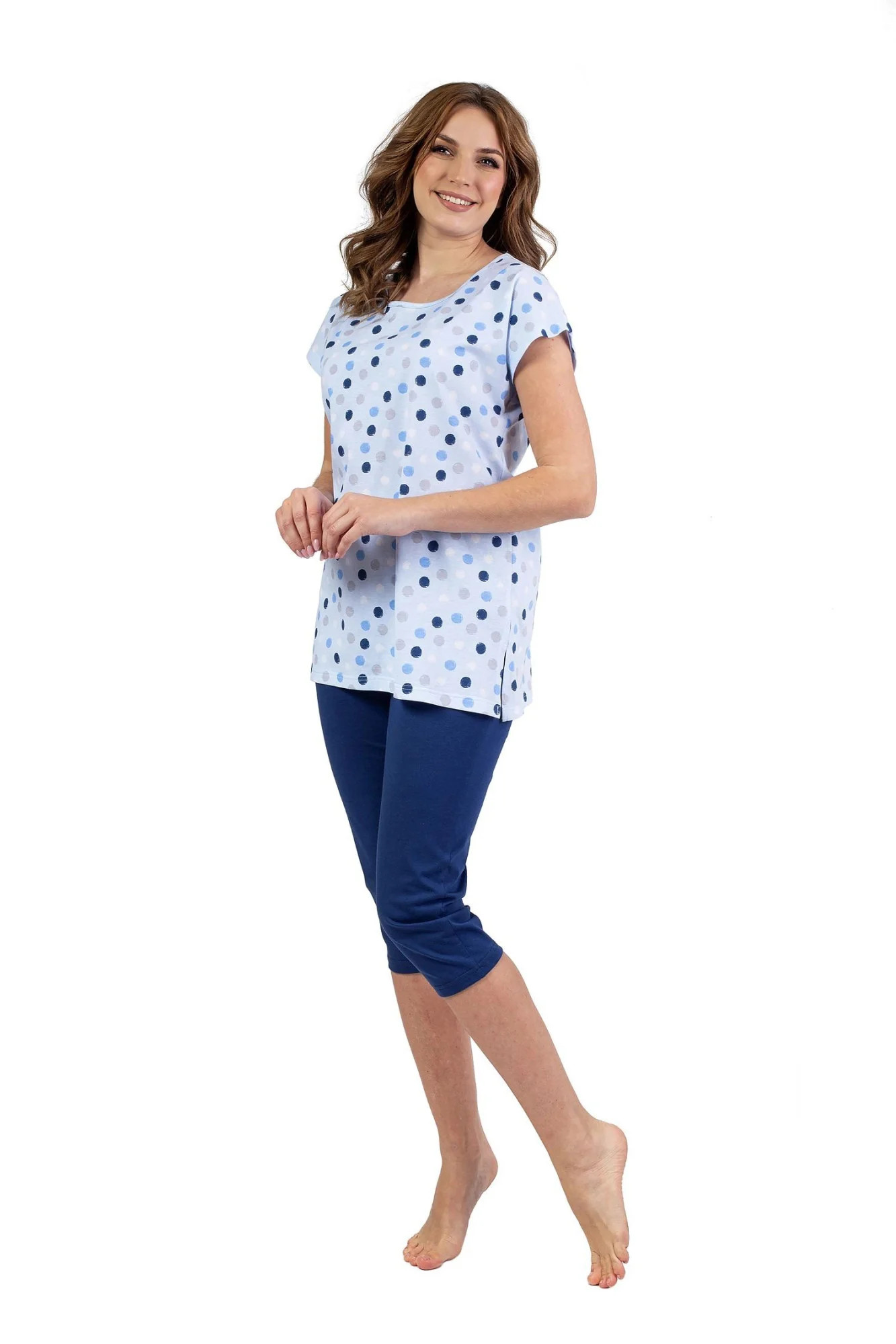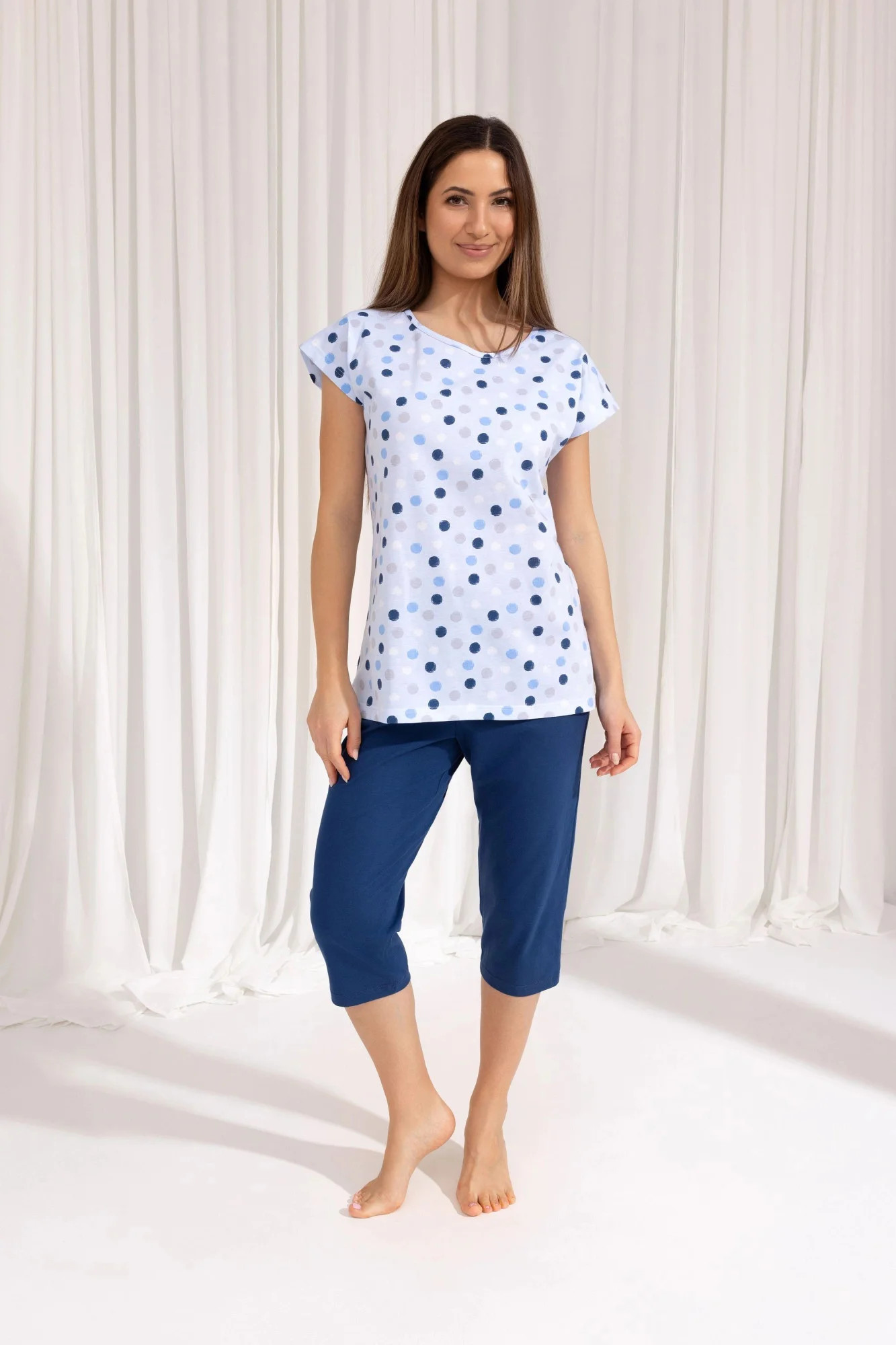 Dámské pyžamo 690 blue REGINA - z vysoce jakostní bavlny - krémové tričko s krátkými rukávy - s potiskem barevných puntíků - jednobarevné capri kalhoty