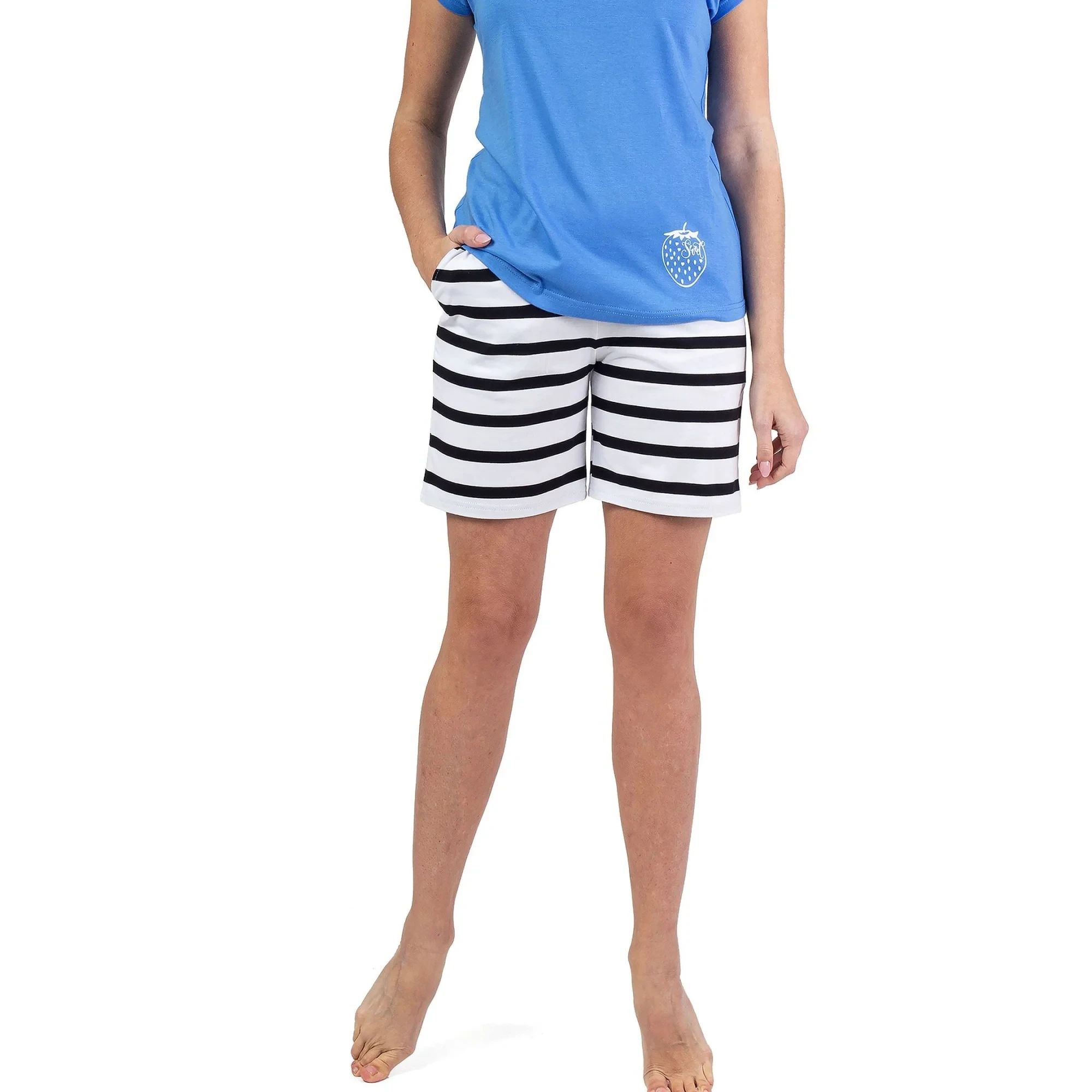 Dámské pyžamo 697 blue REGINA - z vysoce jakostní bavlny - světle modré tričko s krátkými rukávy - kulatý výstřih s pruhovaným lemováním - zdobené potiskem na přední straně - pruhované šortky