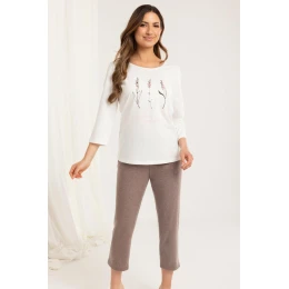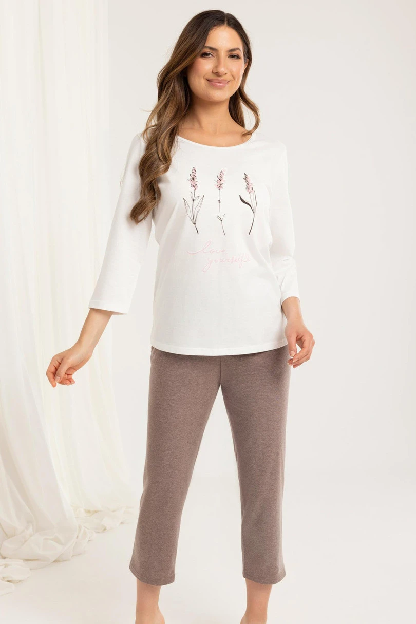 Piżama damska 703 J/25 to komfortowy komplet wykonany z miękkiej, oddychającej bawełny. Koszulka z rękawem 3/4 i półokrągłym dekoltem została ozdobiona delikatnym, roślinnym nadrukiem z przodu, nadającym całości kobiecego i spokojnego charakteru. Jednolite spodnie o długości 7/8 świetnie uzupełniają zestaw, zapewniając swobodę ruchów i idealne dopasowanie. Model doskonały na wiosnę, lato oraz do codziennego relaksu w domu.