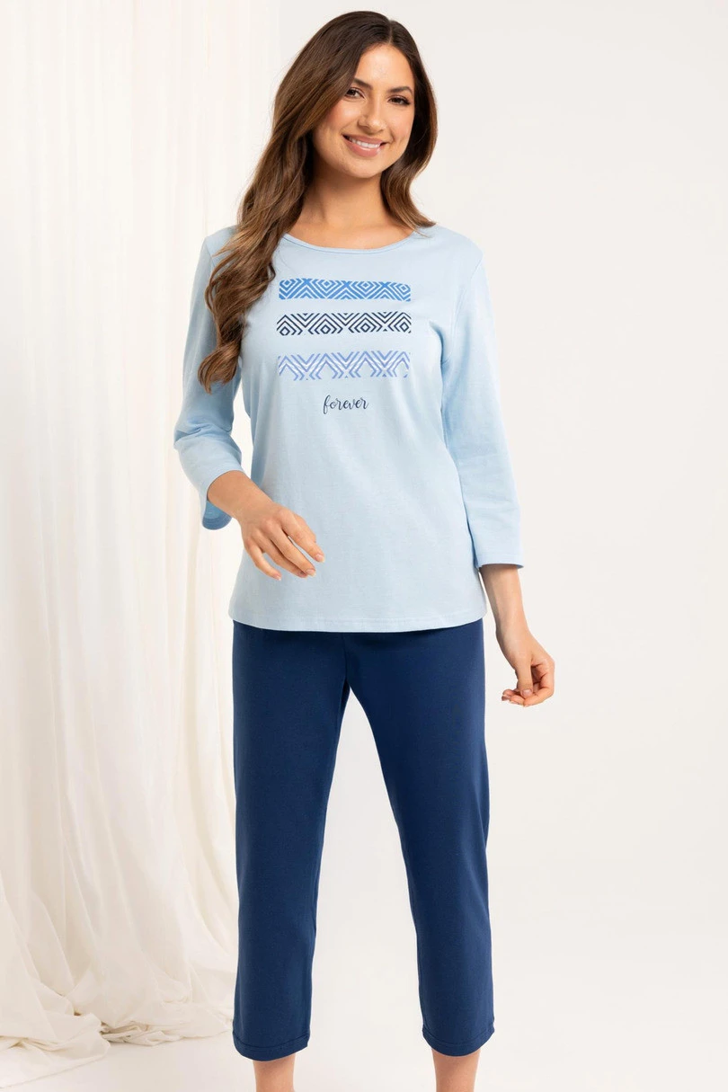 Piżama damska 709 BIG J/25 to wygodny i uniwersalny zestaw nocny wykonany z naturalnej, oddychającej bawełny. Jednolita koszulka z rękawem 3/4 została ozdobiona kolorowym nadrukiem z przodu, który dodaje całości lekkości i energii. Spodnie o długości 3/4, również w jednolitym kolorze, zapewniają komfort noszenia i swobodę ruchów, szczególnie w cieplejsze dni. Komplet zapakowany w foliowy worek – praktyczny wybór także na prezent.