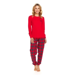 Dámské pyžamo 7127 Doctornap - z vysoce jakostní bavlny - červené tričko s dlouhými rukávy - na přední straně zdobené potiskem - dlouhé kostkované kalhoty s kapsami - rukávy a nohavice zakončené stahovacím lemem - certifikát OEKO-TEX Standard 100