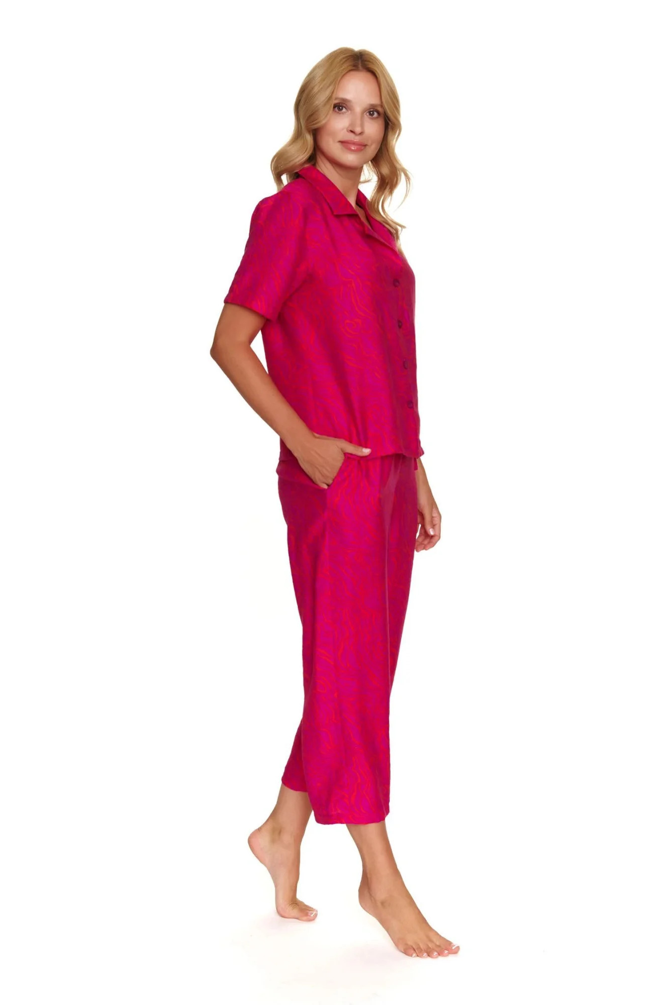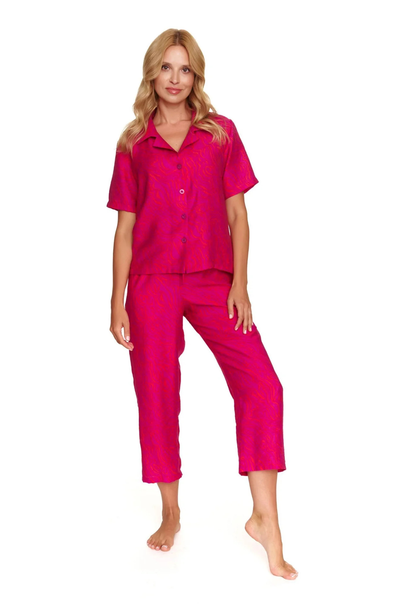 Dámské pyžamo 7167 Doctornap - z vysoce jakostní viskózy - fuchsiová košile s krátkými rukávy a límcem - se zapínáním na knoflíky - kalhoty fuchsiové barvy s kapsami - se vzorem - certifikát OEKO-TEX Standard 100