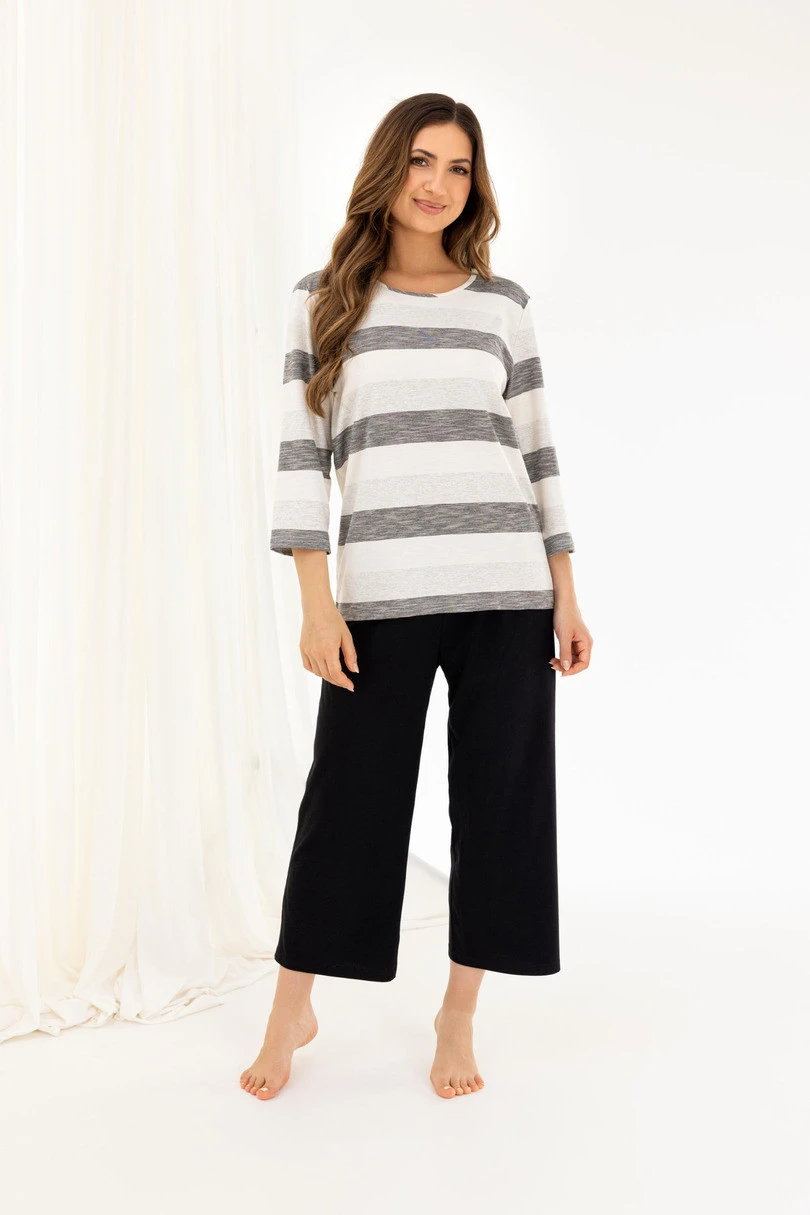 Dámské pyžamo 719 J/25 je pohodlná souprava ideální pro teplejší noci a každodenní domácí relaxaci. Tričko s 3/4 rukávy a kulatým výstřihem je vyrobeno z měkké a pružné viskózy s elastanem pro dokonalé přizpůsobení. Soupravu doplňují široké kalhoty ve 3/4 délce ze 100% vzdušné bavlny, které zaručují pohodlí a volnost pohybu. Pyžamo kombinuje moderní styl s funkčností – ideální pro jaro a léto.