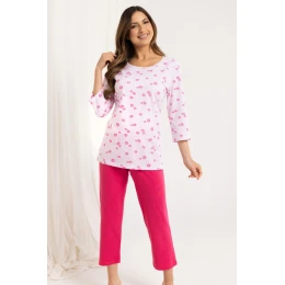 Piżama damska 720 J/25 to wygodny i stylowy zestaw wykonany z wysokiej jakości, 100% bawełny. Wzorzysta koszulka z rękawem 3/4 i półokrągłym dekoltem nadaje całości energii i delikatnego uroku. Spodnie o długości 7/8 w jednolitym kolorze świetnie równoważą wzór góry, tworząc harmonijny i praktyczny komplet idealny na cieplejsze noce lub relaks w domu. Naturalna bawełna zapewnia przewiewność i wygodę przez całą noc.