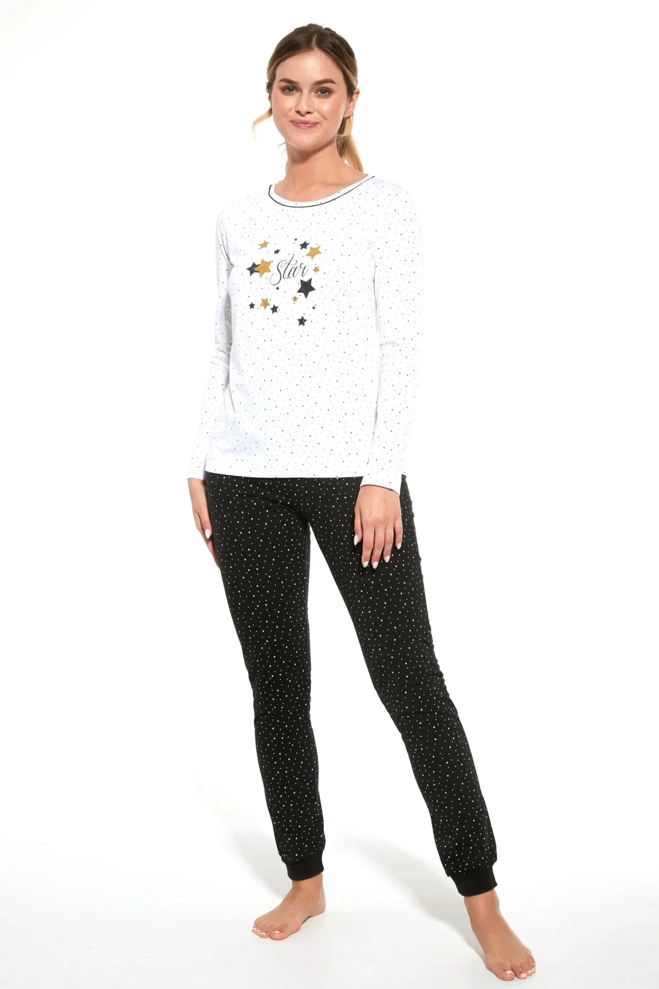 Dámské pyžamo 722/302 Star CORNETTE - bílá barva - vyrobené z vysoce kvalitní a měkké bavlny - tričko je bílé barvy s dlouhými rukávy - zdobené barevným potiskem - dlouhé vzorované kalhotyMateriálové složení: 100% bavlna