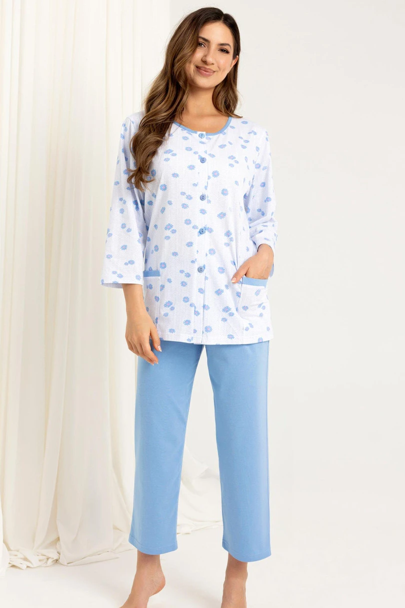 Piżama damska 723 BIG J/25 to połączenie wygody, kobiecego stylu i funkcjonalności. Wykonana z wysokiej jakości, 100% bawełny, jest przyjemna w dotyku, przewiewna i idealna na każdą porę roku. Góra zestawu to koszulka z rękawem 7/8, zapinana na guziki, ozdobiona kwiatowym nadrukiem i wyposażona w praktyczne kieszenie po bokach. Do kompletu dołączone są gładkie, długie spodnie o długości przed kostkę, z elastyczną gumką w pasie, która zapewnia wygodne dopasowanie.
