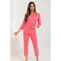 Piżama damska 724 BIG J/25 to idealny wybór na cieplejsze noce i codzienny domowy relaks. Wykonana z wysokiej jakości, 100% bawełny, gwarantuje komfort noszenia i przewiewność. Koszulka z rękawem 3/4, półokrągłym dekoltem i ozdobnym nadrukiem z przodu prezentuje się stylowo i kobieco. Uzupełniają ją jednolite spodnie o długości 7/8, które dzięki klasycznemu krojowi zapewniają pełną swobodę ruchów i wygodę użytkowania.