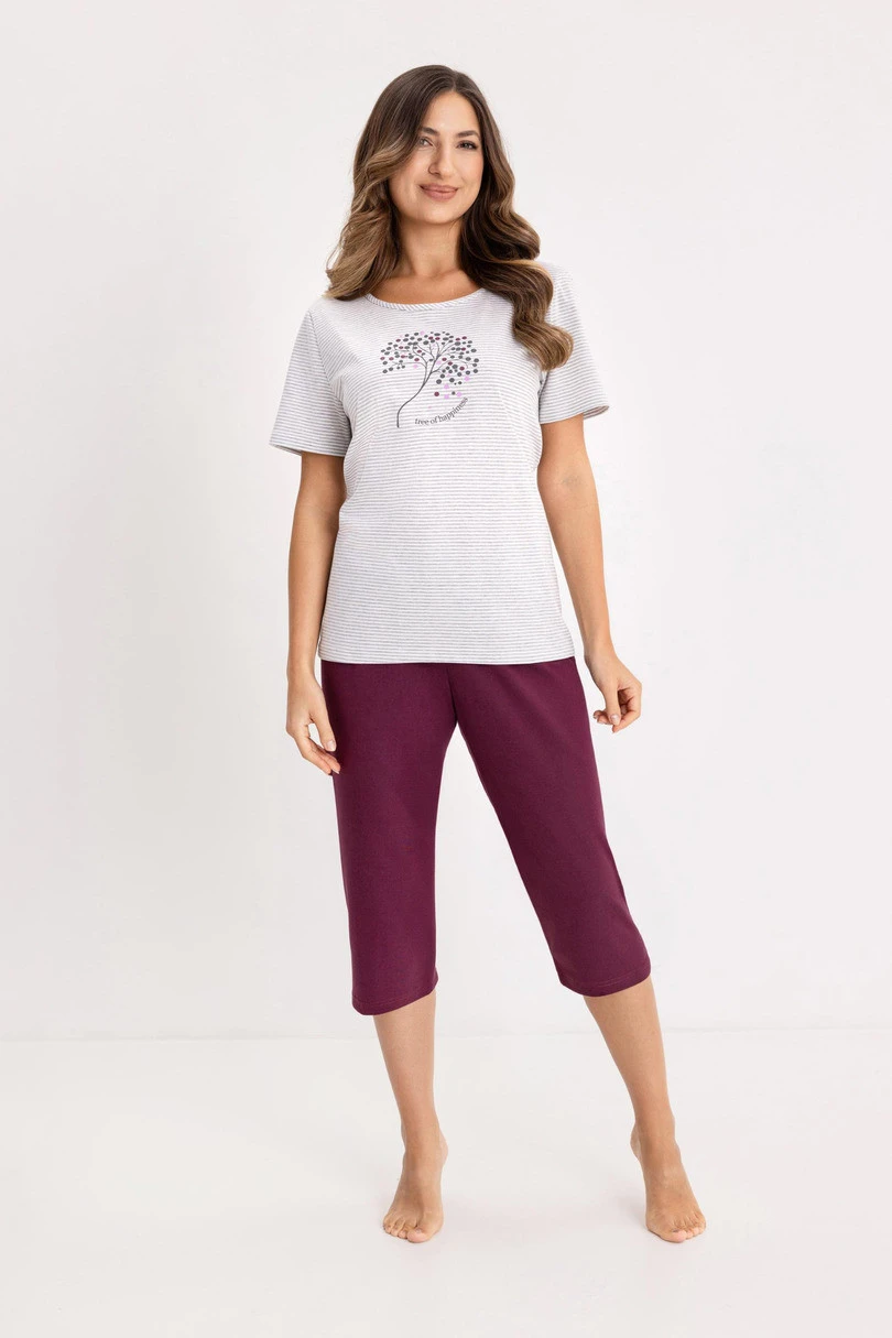 Dámské pyžamo 732 BIG W/26 REGINA je pohodlná a stylová noční souprava vyrobená ze 100% přírodní bavlny. Prodyšný, měkký materiál zajišťuje pohodlný spánek a příjemný pocit na pokožce po celou noc. Pruhované tričko s krátkými rukávy a půlkulatým výstřihem zaručuje volnost pohybu a ozdobný potisk na přední straně dodává celé soupravě módní, ženský charakter. Pevné kalhoty ve 3/4 délce soupravu skvěle doplňují a zajišťují pohodlí a lehkost při nošení. Je to ideální dámské pyžamo na spaní a domácí relaxaci v každém ročním období.