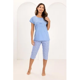 Wygodna piżama damska idealna do snu i domowego wypoczynku. Zestaw składa się z koszulki z krótkim rękawem w pastelowym kolorze, ozdobionej delikatnym nadrukiem na przodzie, oraz spodni o długości 3/4 z drobnym, subtelnym wzorem. Luźny, prosty krój zapewnia swobodę ruchów i komfort noszenia przez całą noc. Jasna, pastelowa kolorystyka nadaje całości świeżości i lekkości, sprawiając, że piżama doskonale sprawdzi się szczególnie w cieplejsze dni.