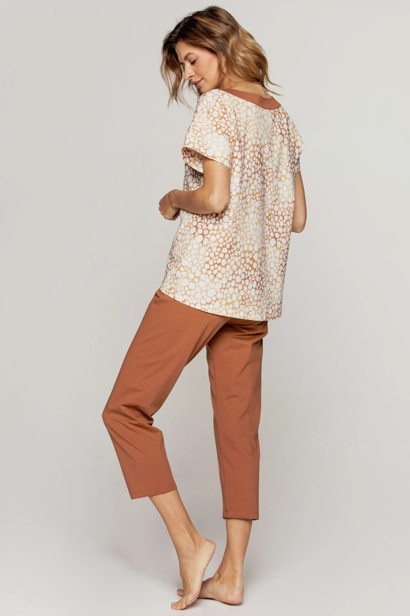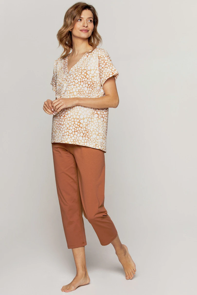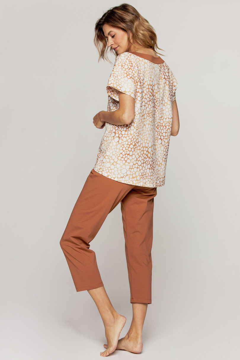 Dámské pyžamo, které je vyrobené z velmi kvalitní tkaniny s moderním zvířecím vzorem ve velbloudí barvě.