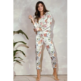 Dámské pyžamo se 7/8 dlouhými rukávy ze vzorované bavlny, kulatý výstřih, 7/8 dlouhé kalhoty, ozdobná šňůrka v pase.