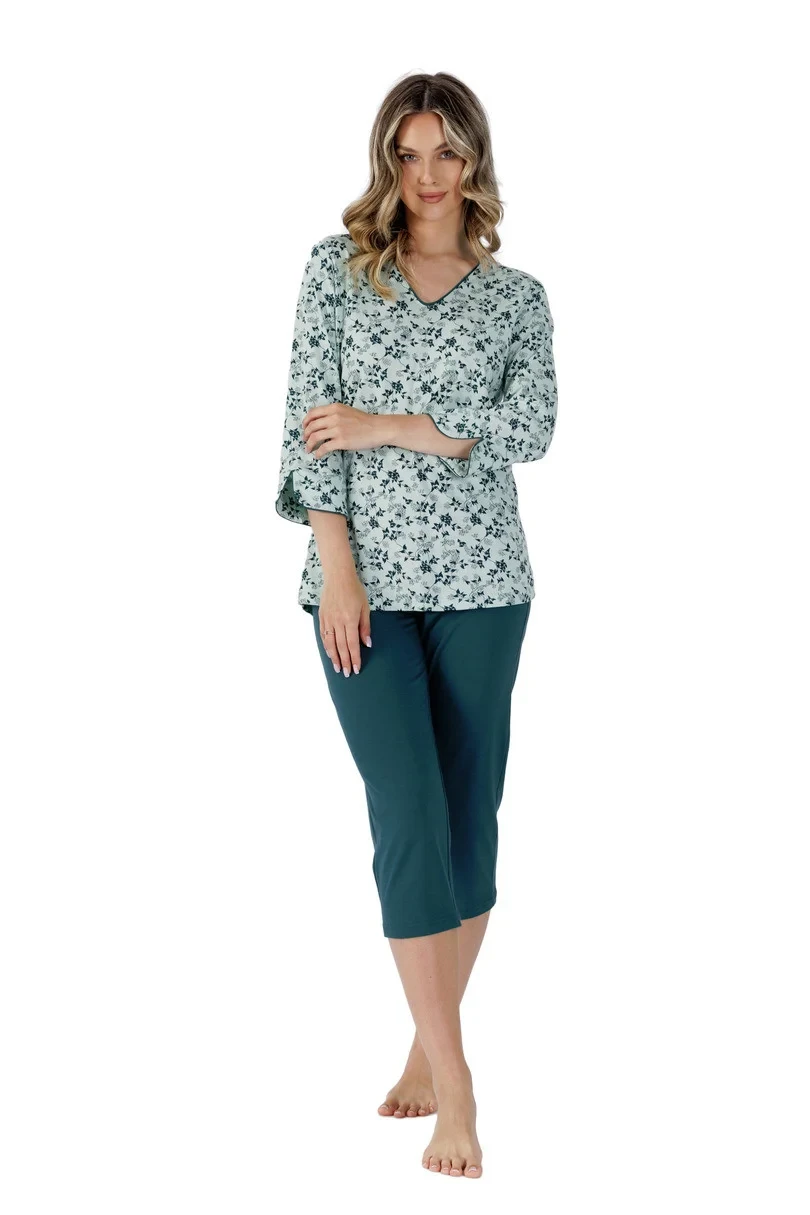 Dámské pyžamo se vzorovaným výstřihem a 3/4 rukávy. Komplet doplňují pevné kalhoty ve 3/4 délce.