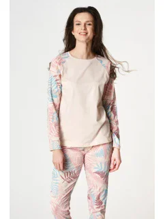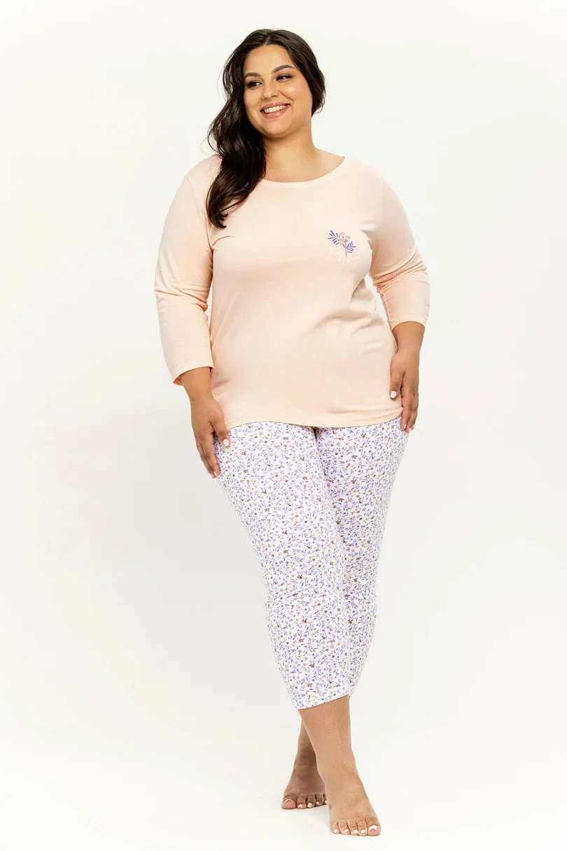 Dámské pyžamo s rukávy v délce 7/8, jednobarevné, na prsou potisk, vzorované kalhoty v délce 7/8.