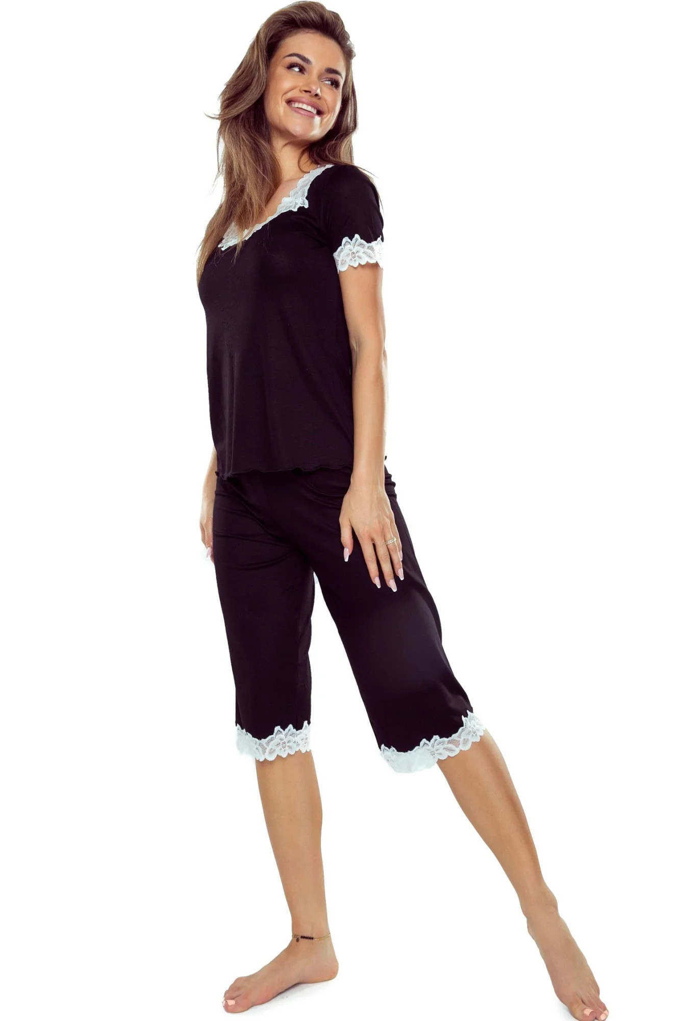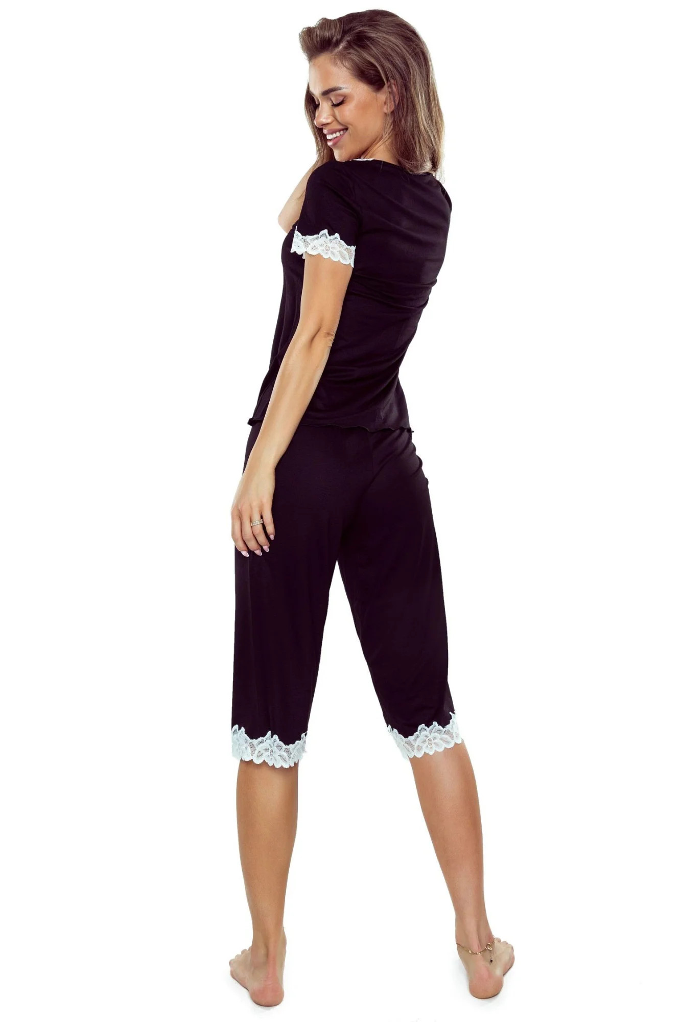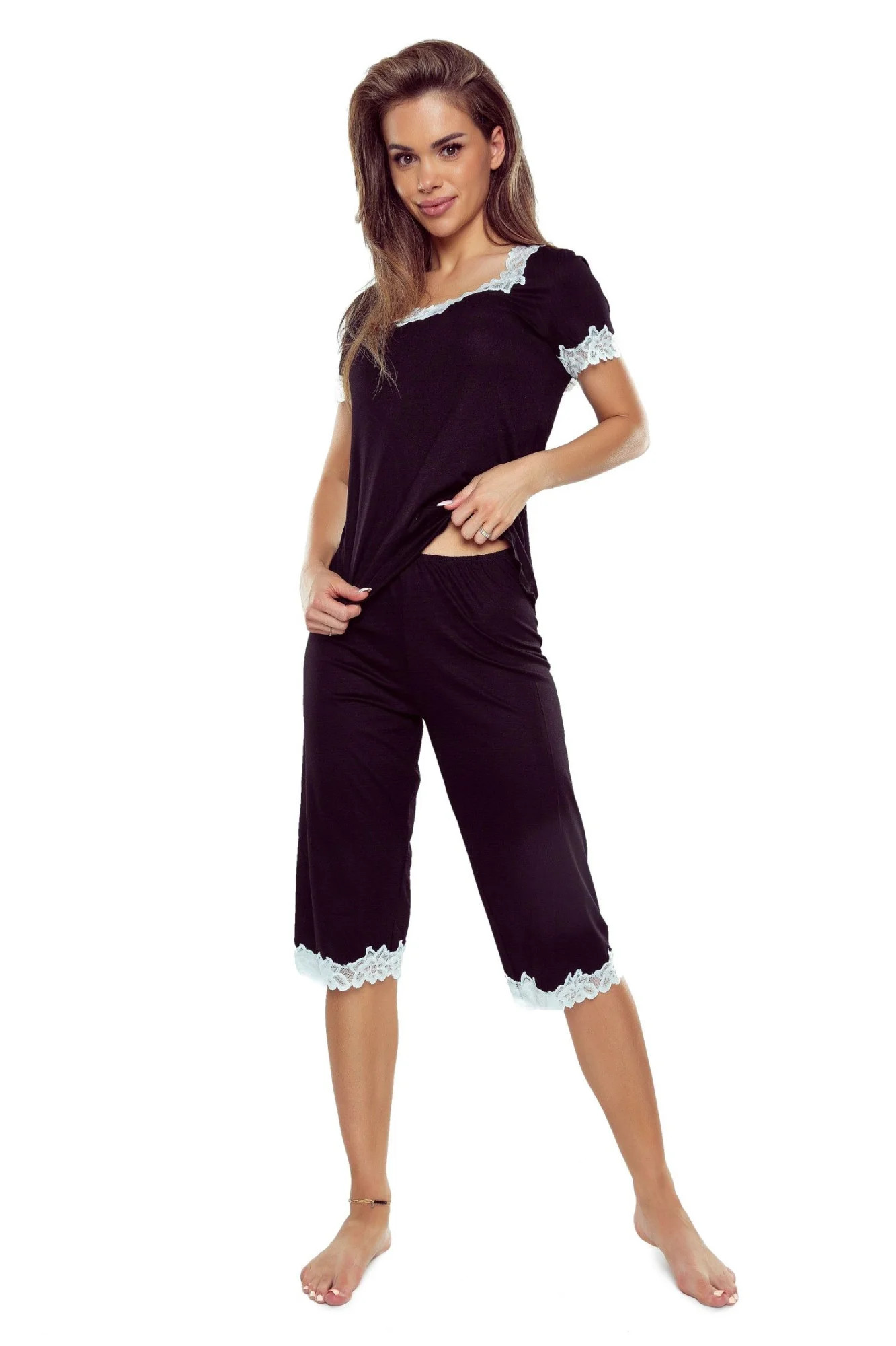 Dámské pyžamo Aster plus ELDAR - černá barva - z vysoce jakostní viskózy - krátké rukávy - volné capri kalhoty - výstřih, rukávy i nohavice zakončené krémovou krajkou