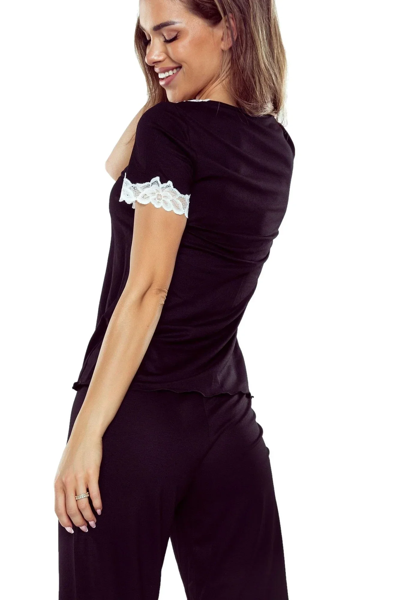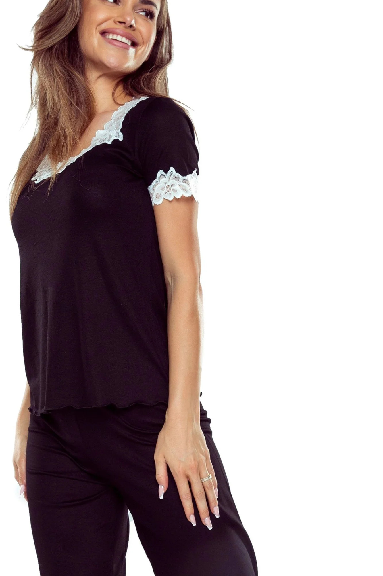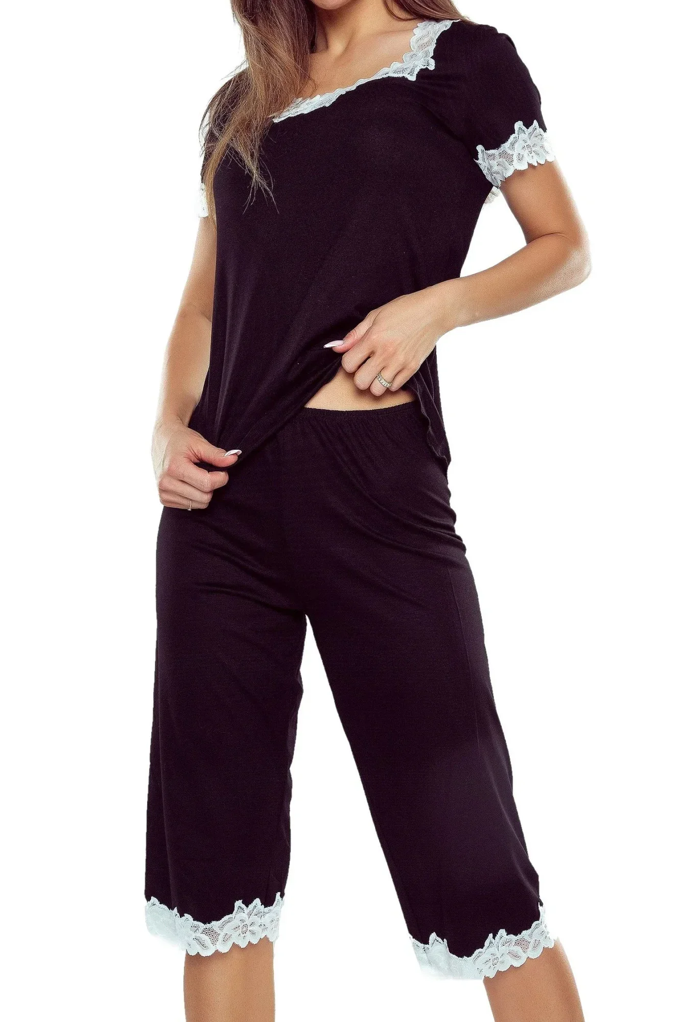 Dámské pyžamo Aster plus ELDAR - černá barva - z vysoce jakostní viskózy - krátké rukávy - volné capri kalhoty - výstřih, rukávy i nohavice zakončené krémovou krajkou