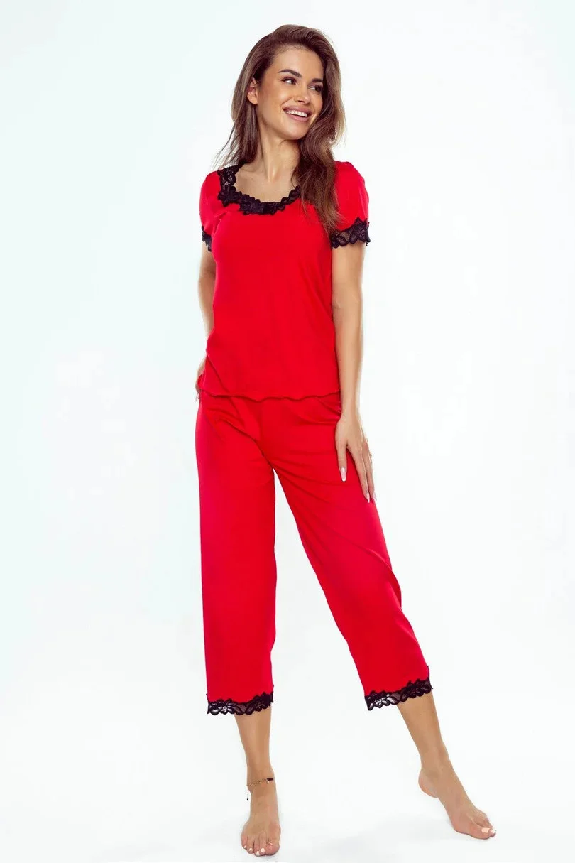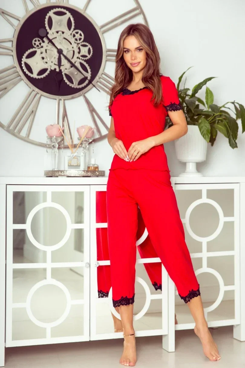 Pyžamo Viscose s krátkými rukávy a 3/4 dlouhými kalhotami. Zakončené kontrastní květinovou krajkou na výstřihu, rukávech a nohavicích