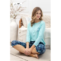 Dámské pyžamo Asteria 1651 značky Leveza je jedinečnou kombinací pohodlí a ženského stylu. je vyrobeno výhradně z přírodní, prodyšné bavlny a poskytuje pohodlí při spánku i každodenní relaxaci. papírově zelená halenka s kulatým výstřihem, 7/8 rukávy a jemným květinovým potiskem podtrhuje jemný ženský charakter. 3/4 kalhoty v rybářském stylu v tmavě modré barvě jsou zdobeny květinovým vzorem a saténovou mašlí v pase, která dodává eleganci a šarm. toto pyžamo je k dispozici ve velikostech M–2XL a je ideální jako pohodlná a stylová volbaór pro každou noc.