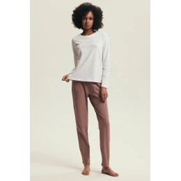 Model składa się z białej bluzki z długim rękawem, ozdobionej motywującym napisem "Only good vibes", oraz dopasowanych spodni w odcieniu przytłumionego brązu. Luźny krój oraz delikatny materiał sprawiają, że piżama idealnie układa się na ciele, zapewniając swobodę ruchów.