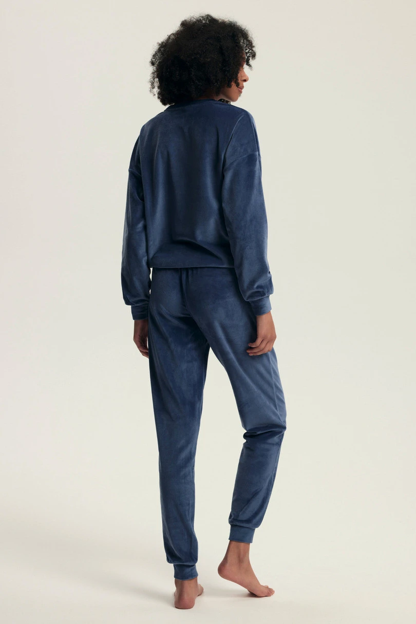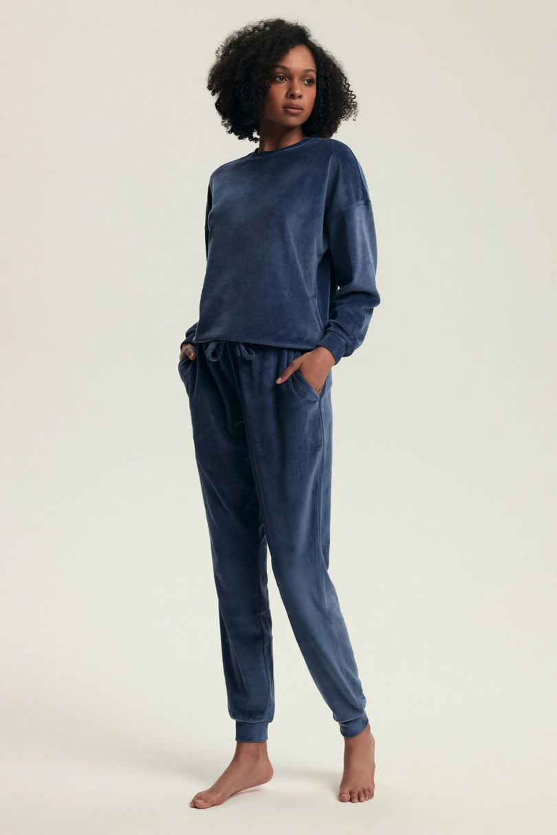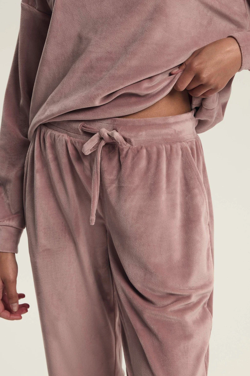 Model dostępny jest w dwóch eleganckich kolorach: pudrowym różu oraz głębokim granacie. Bluzka z długim rękawem oraz spodnie z kieszeniami i ściągaczami u dołu tworzą komfortowy komplet idealny zarówno do snu, jak i jako modny zestaw homewear. Elastyczny pas ze sznurkiem zapewnia dopasowanie do sylwetki, a welurowe wykończenie dodaje luksusowego charakteru.
