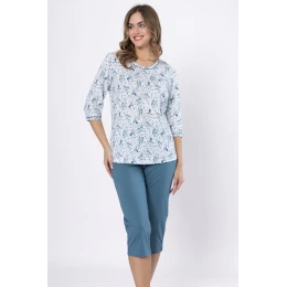 Postaw na komfort i kobiecy styl z piżamą BENITA 1640 od marki Leveza. Wykonana w 100% z wysokogatunkowej bawełny, gwarantuje naturalną przewiewność i miękkość, które idealnie sprawdzą się podczas snu i wieczornego relaksu. Górna część piżamy to bluzka z rękawem 3/4, ozdobiona kontrastowymi wypustkami i uroczo zdobiona motywem ptaszków. Morsko-biała kolorystyka dodaje świeżości i lekkości. Spodnie o długości 3/4 w jednolitym morskim kolorze dopełniają całości, zapewniając swobodę ruchów i wygodę użytkowania. Dostępna w rozmiarach od M do 2XL – idealna dla każdej kobiety, która ceni wygodę i estetykę.