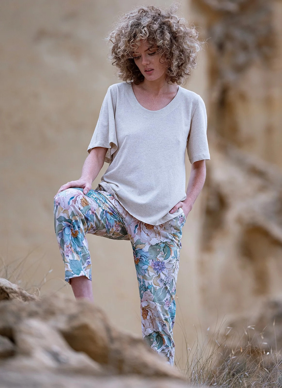 - bavlněné kalhoty s dlouhými nohavicemi s květinovým potiskem